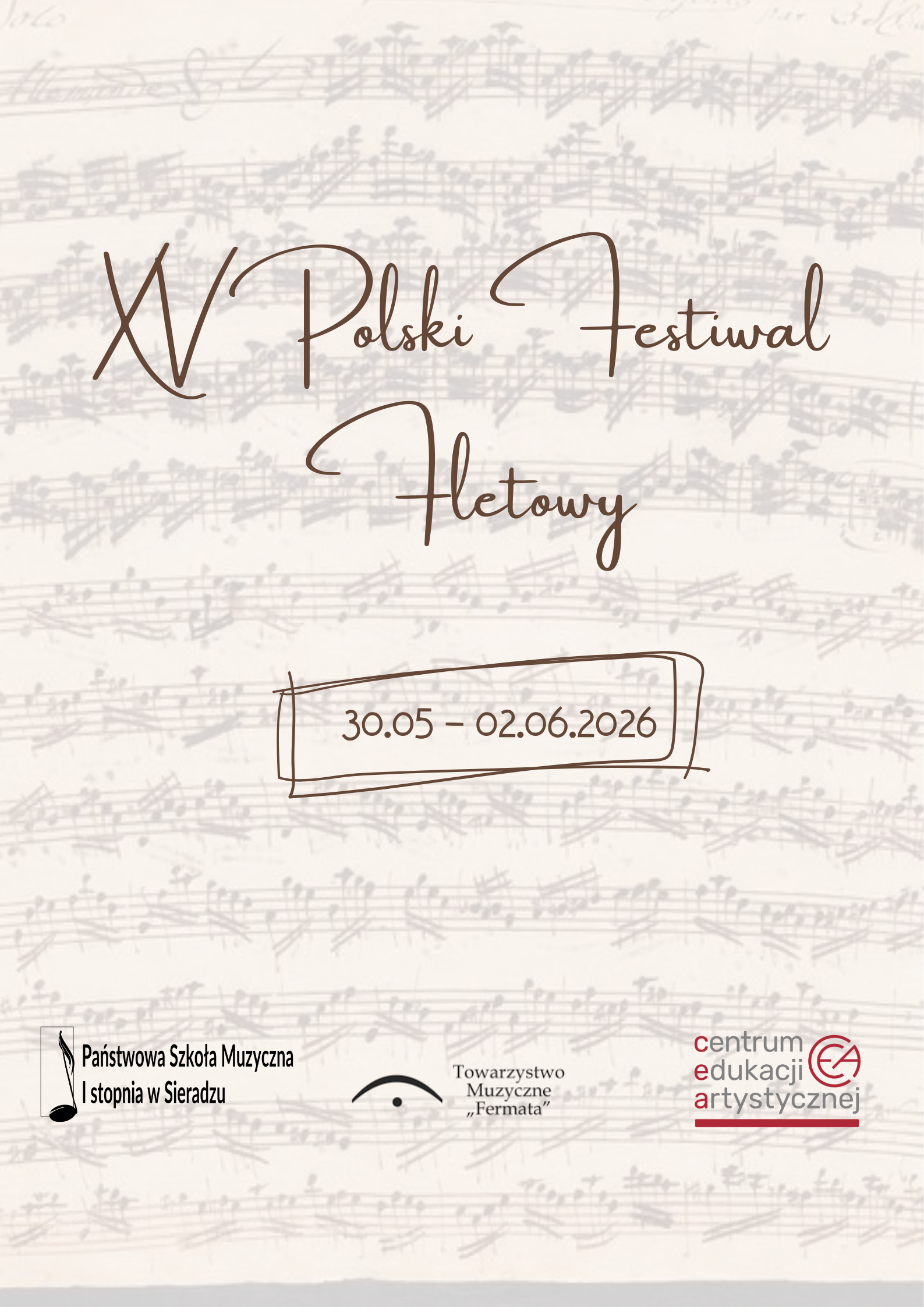 Serdecznie zapraszamy na XV Polski Festiwal Fletowy. Pierwsza edycja miała miejsce w 1995 roku. Od początku kierownictwo artystyczne sprawuje prof. dr hab. Antoni Wierzbiński z Akademii Muzycznej im. Grażyny i Kiejstuta Bacewiczów w Łodzi. Organizatorem konkursu jest Centrum Edukacji Artystycznej przy współpracy z Państwową Szkołą Muzyczną I stopnia w Sieradzu i Towarzystwem Muzycznym "Fermata".