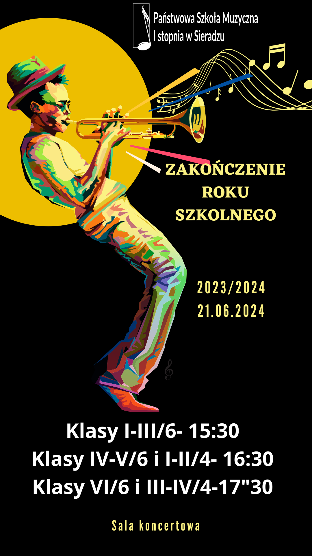 Serdecznie zapraszamy na uroczystość zakończenia roku szkolnego 2023/2024, która odbędzie się 21.06.2024 roku w Sali Koncertowej naszej szkoły w następującym porządku: