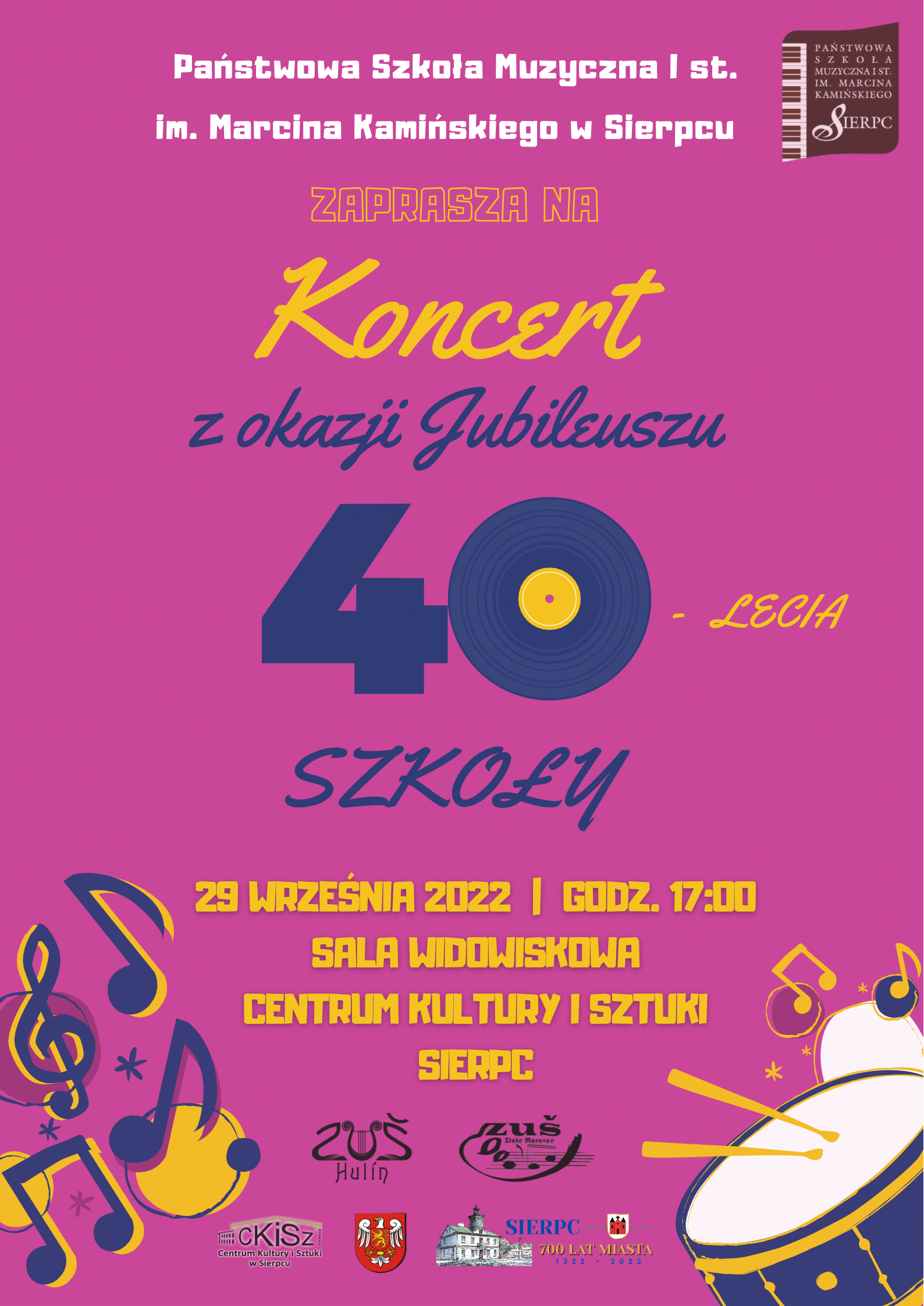 Zapraszamy na obchody Jubileuszu 40-lecia naszej Szkoły w dniu 29 września 2022 r. O godz. 11.00 w kościele p.w. św. Wita, Modesta i Krescencji (sierpecka Fara) zostanie odprawiona Msza św. w intencji Szkoły, a o godz. 17.00 w sali widowiskowej Centrum Kultury i Sztuki w Sierpcu odbędzie się Koncert z udziałem absolwentów i pedagogów PSM I st. w Sierpcu oraz naszych przyjaciół ze szkół artystycznych w Hulinie (Czechy) i Zlatych Moravców (Słowacja).