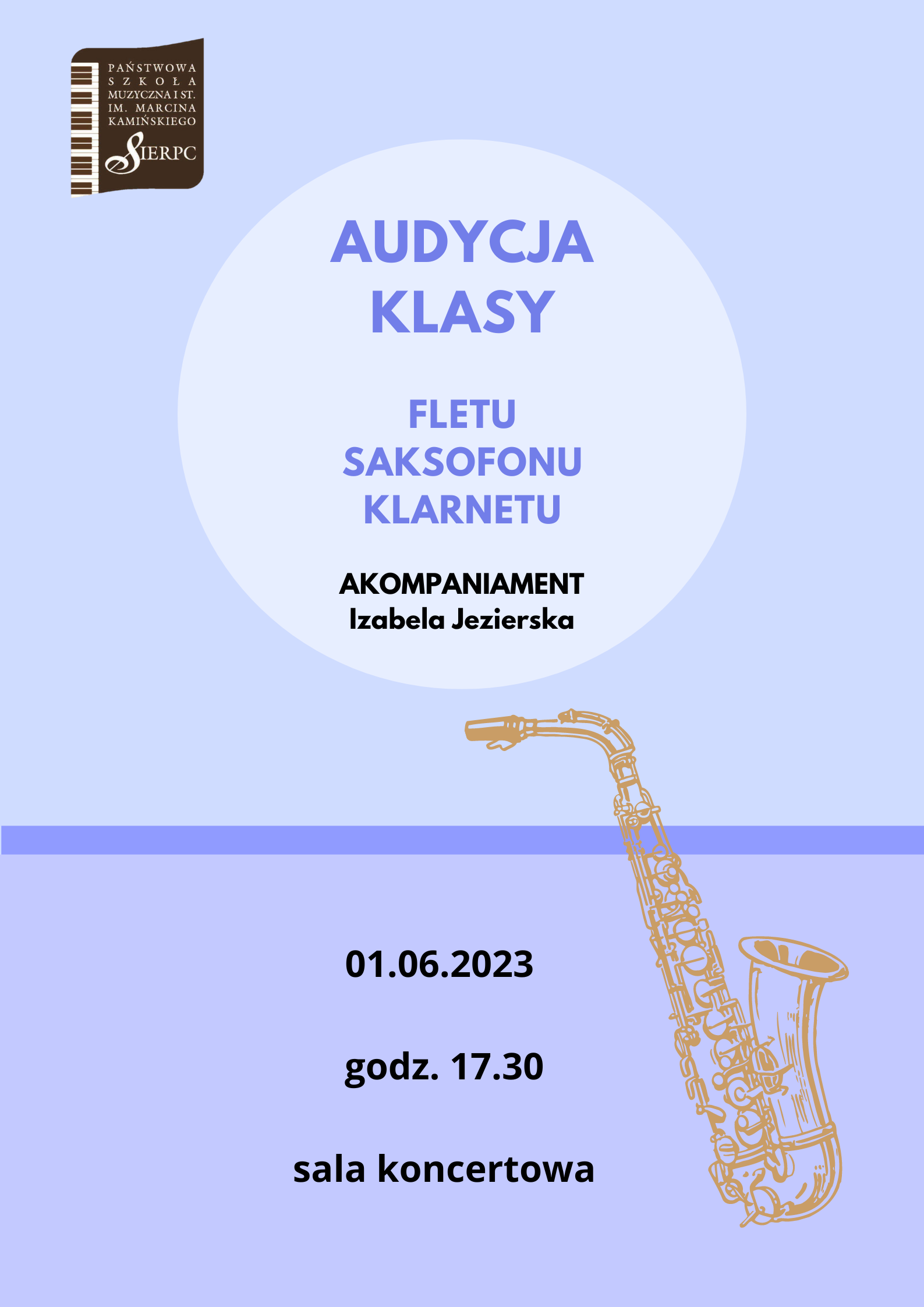 Dnia 01.06.2023 w sali koncertowej naszej szkoły odbędzie się audycja klasy fletu, saksofonu, klarnetu.