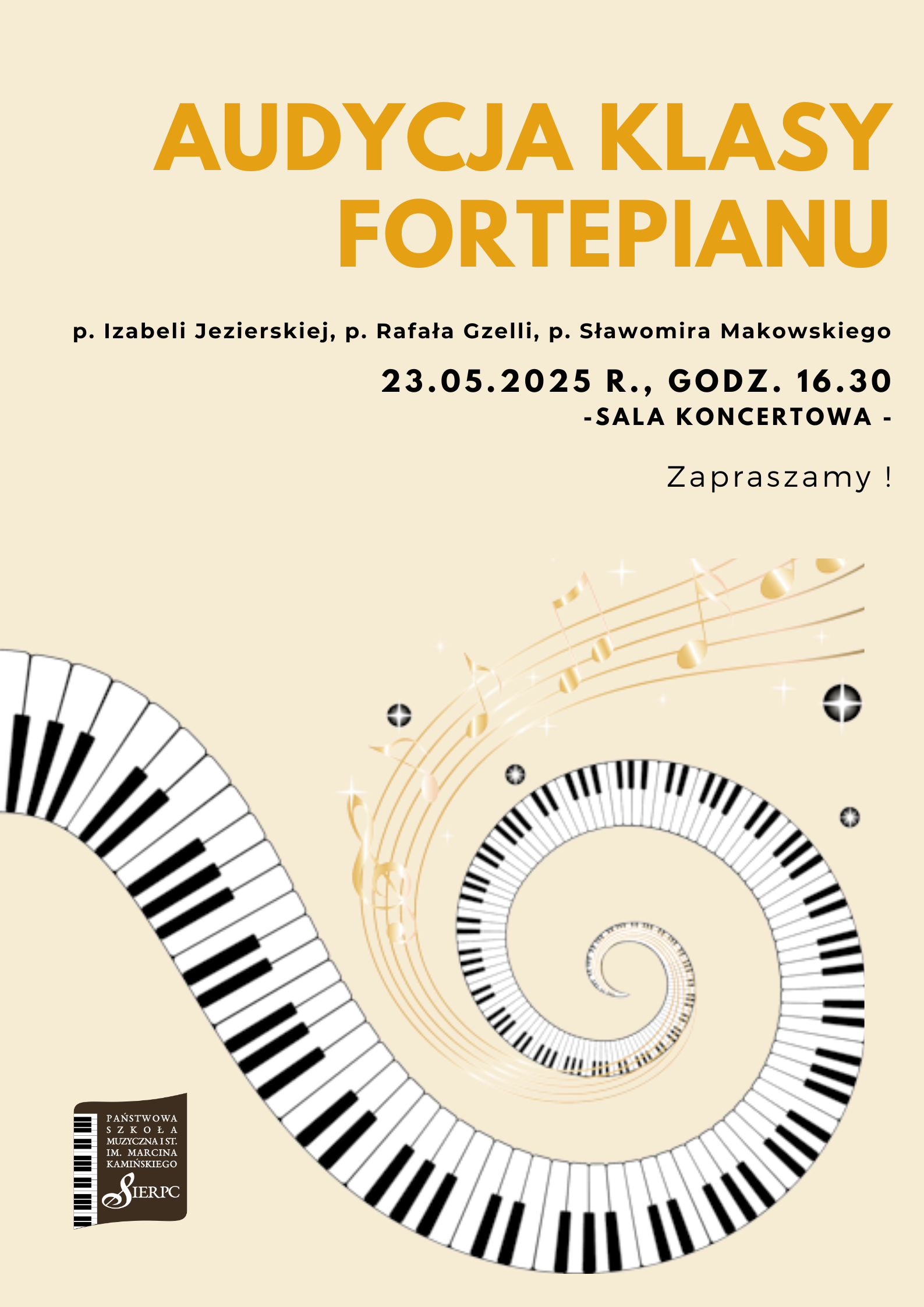 Zapraszamy na popis uczniów klasy fortepianu Pani Izabeli Jezierskiej, Pana Rafała Gzelli, Pana Sławomira Makowskiego, który odbędzie się 23.05.2025 r. o godzinie 16.30 w sali koncertowej.