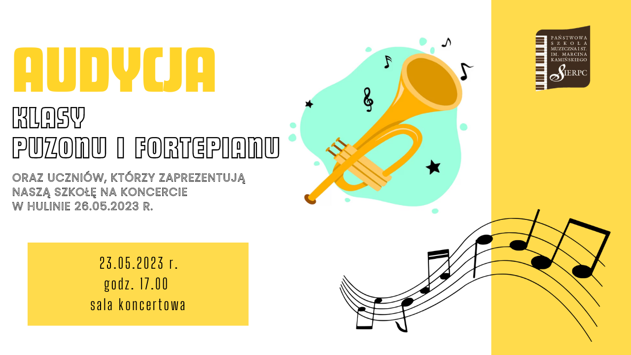 23 maja o godz. 17.00 w sali koncertowej odbędzie się audycja klasy puzonu i fortepianu.