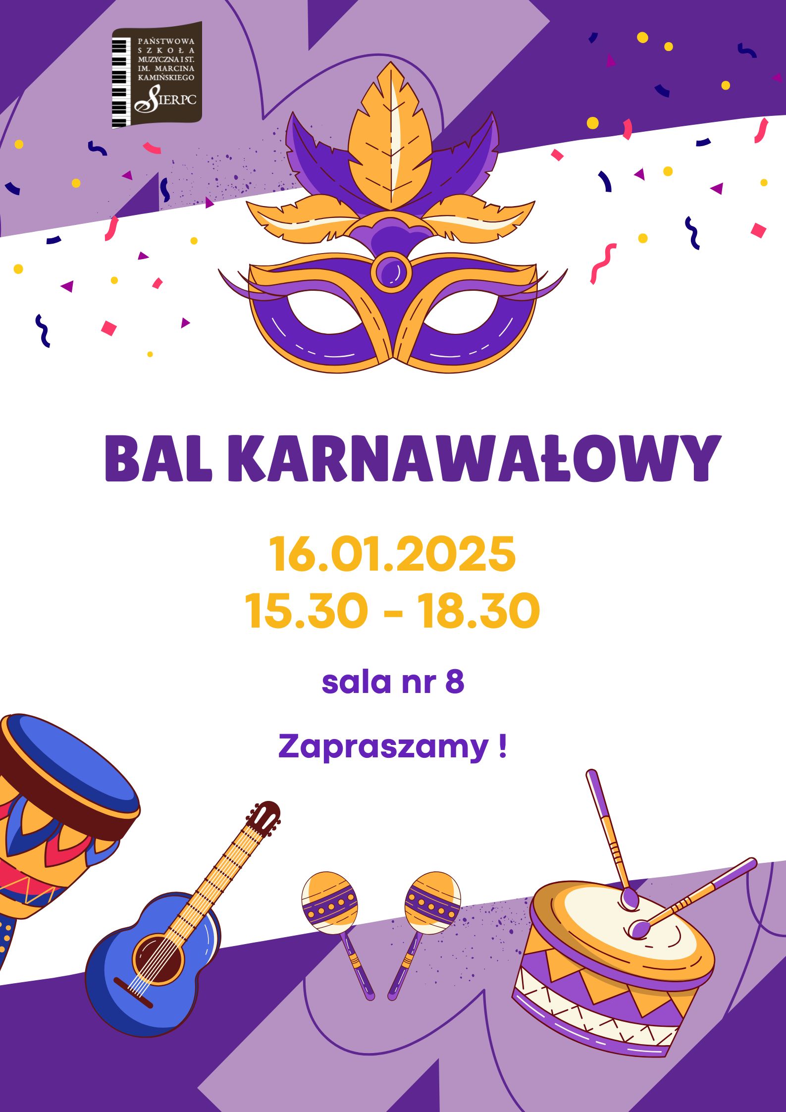 Zapraszamy wszystkich uczniów na bal karnawoły, ktory odbędzie się 16.01.2026 r. w godz. 15.30. - 18.30 w sali nr 8.