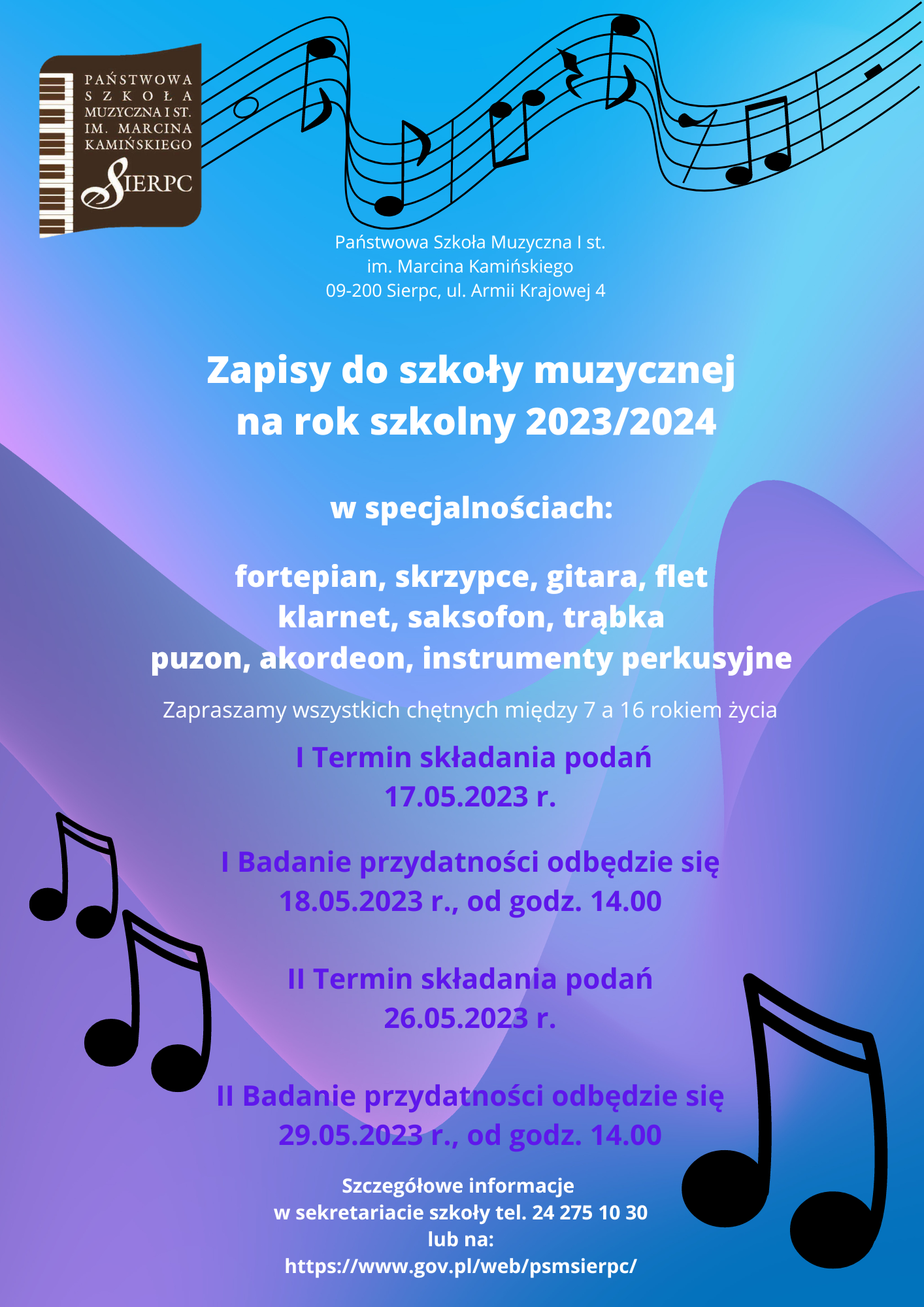Dyrektor Państwowej Szkoły Muzycznej I st. im. Marcina Kamińskiego w Sierpcu ogłasza zapisy dzieci i młodzieży chętnych do nauki gry na instrumentach w następujących specjalnościach: fortepian, skrzypce, gitara, flet, klarnet, saksofon, trąbka, puzon, akordeon, instrumenty perkusyjne.