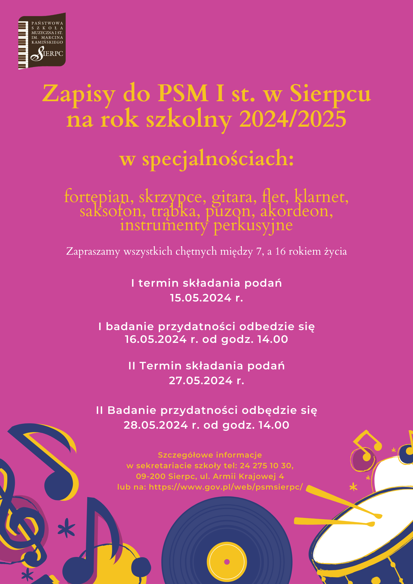 Dyrektor Państwowej Szkoły Muzycznej I stopnia im. Marcina Kamińskiego w Sierpcu ogłasza zapisy dzieci i młodzieży chętnych do nauki gry na instrumentach w następujących specjalnościach: fortepian, skrzypce, gitara, flet, klarnet, saksofon, trąbka, puzon, akordeon, instrumenty perkusyjne.