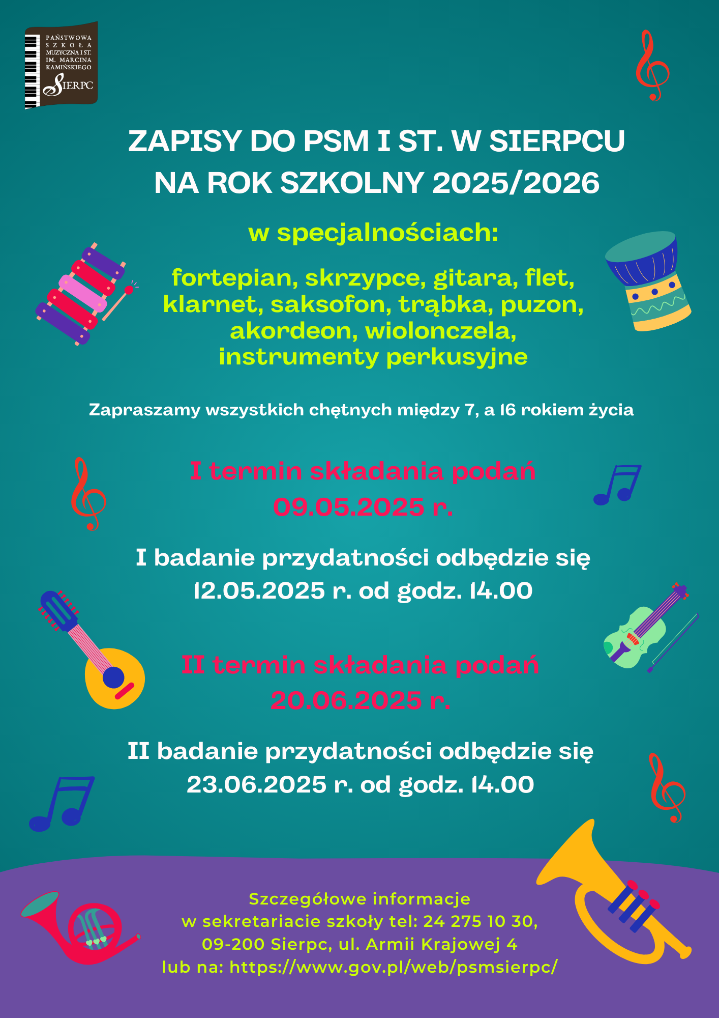 Dyrektor Państwowej Szkoły Muzycznej I stopnia im. Marcina Kamińskiego w Sierpcu ogłasza zapisy dzieci i młodzieży chętnych do nauki gry na instrumentach w następujących specjalnościach: fortepian, skrzypce, gitara, flet, klarnet, saksofon, trąbka, puzon, akordeon, wiolonczela, instrumenty perkusyjne.