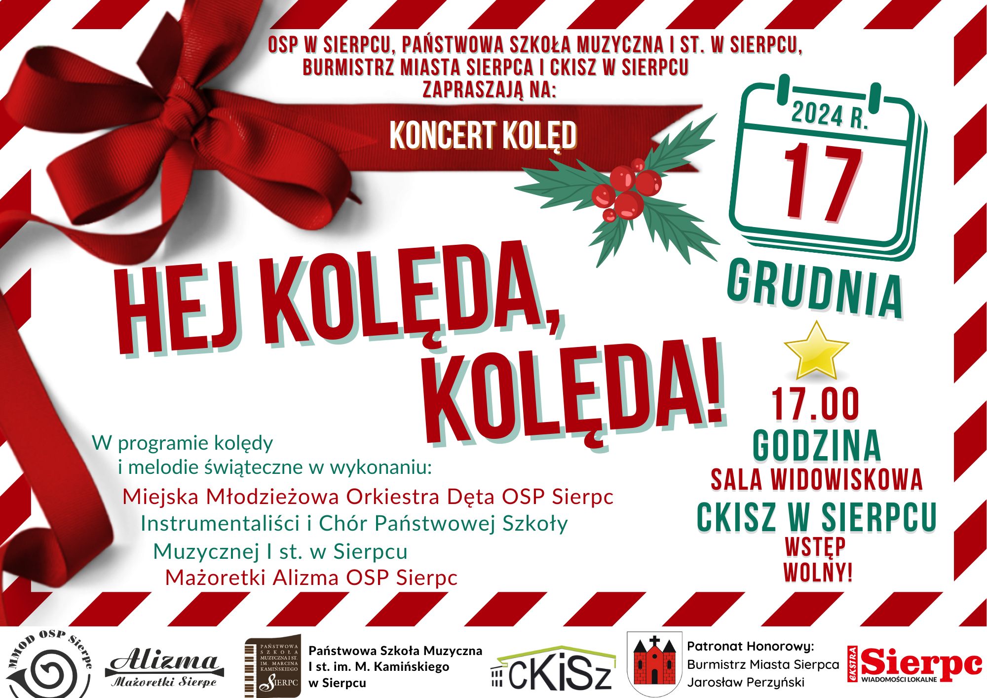Zapraszamy na Koncert w wykonaniu Miejskiej Młodzieżowej Orkiestry Dętej OSP Sierpc, Instrumentalistów, Chóru Państwowej Szkoły Muzycznej I st. w Sierpcu oraz Mażoretek Alizma OSP Sierpc, który odbędzie się 17.12.2024 r. o godzinie 17.00 w sali widowiskowej CKiSZ w Sierpcu.