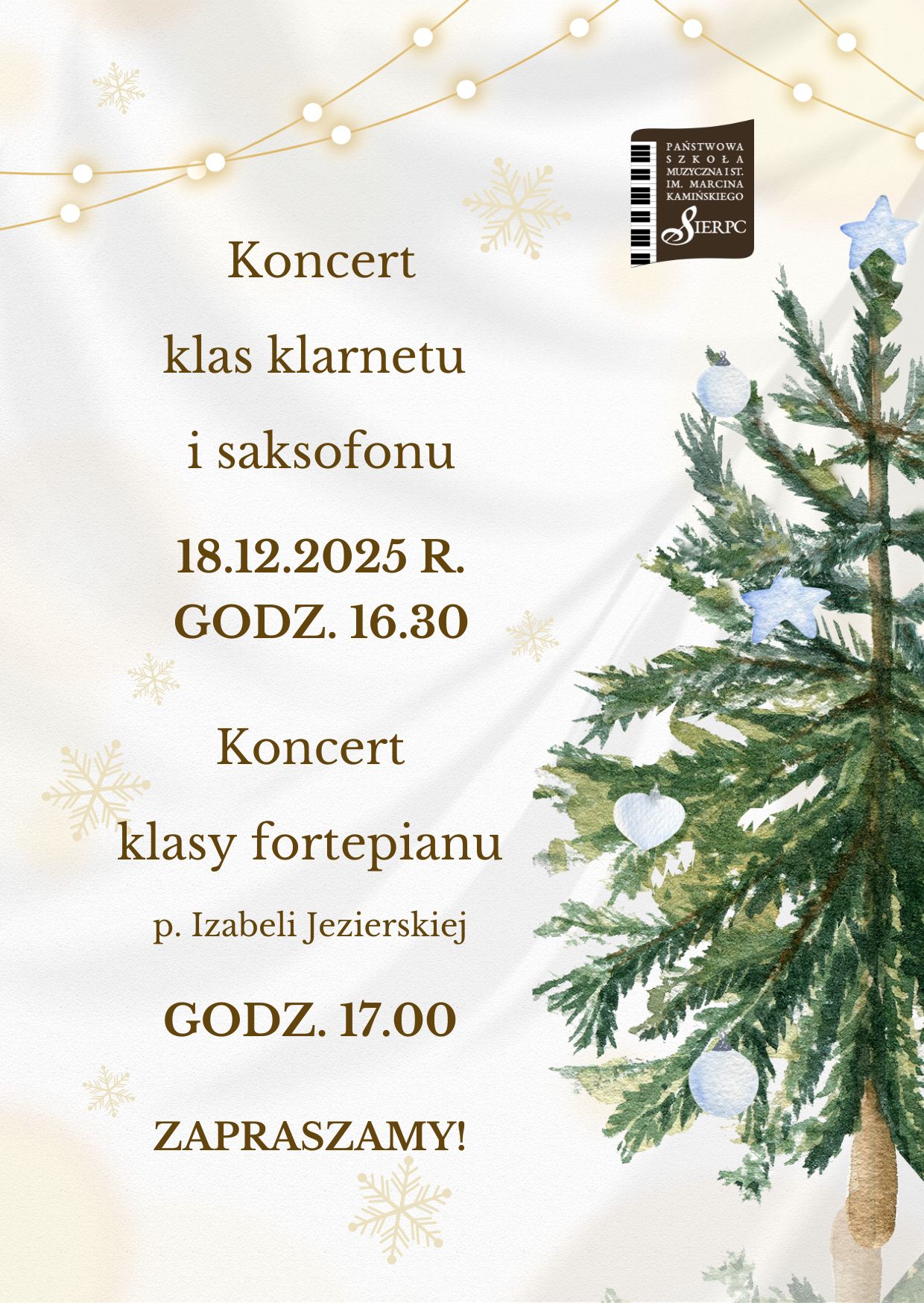 Dnia 18.12.2025 r. zapraszamy na koncert klas klarnetu, saksofonu oraz fortepianu.