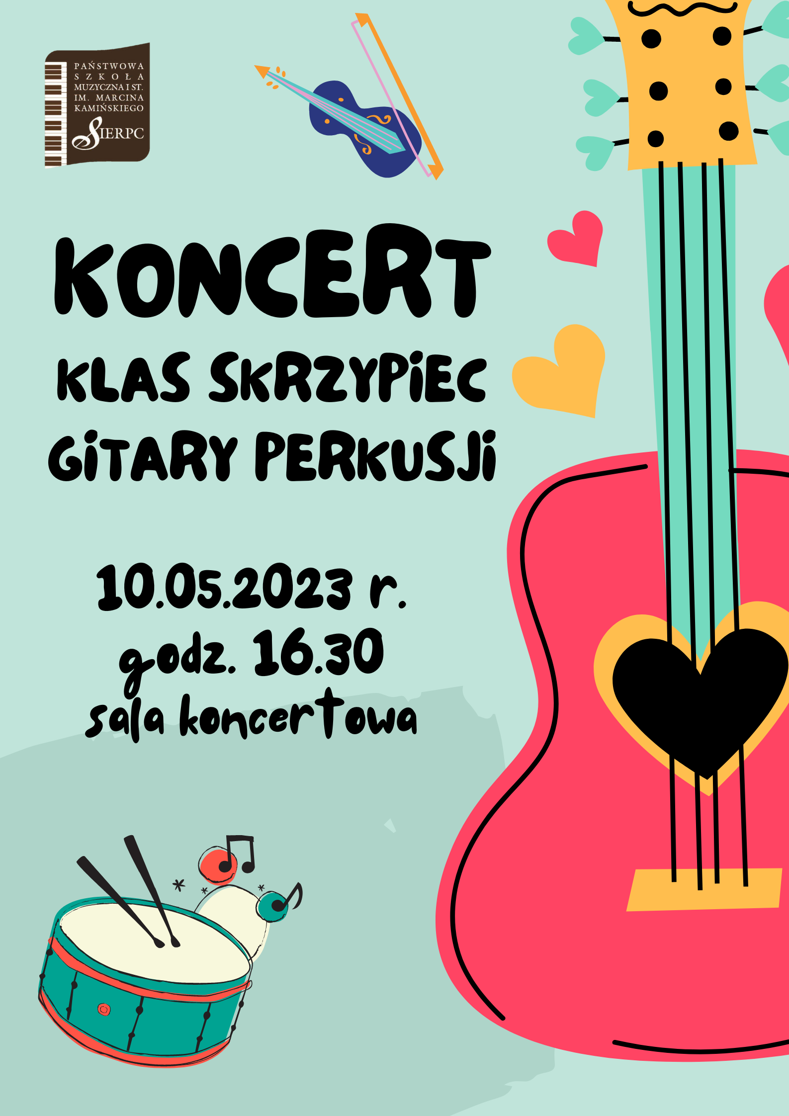 W środę 10 maja 2023 r. zapraszamy na koncert klas skrzypiec, gitary i perkusji. Widzimy się o godz. 16.30.
