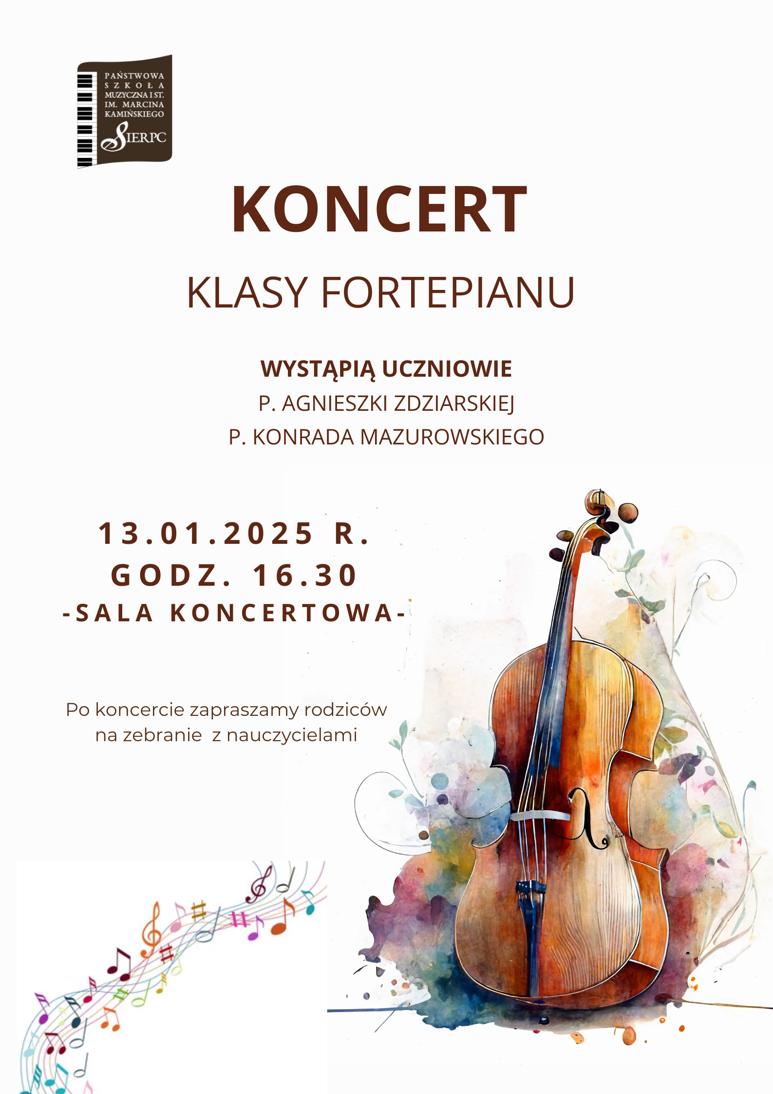 Zapraszamy na Koncert w wykonaniu uczniów klasy fortepianu Pani Agnieszki Zdziarskiej oraz Pana Konrada Mazurowskiego, który odbędzie się 13.01.2025 r. o godzinie 16.30 w sali koncertowej.