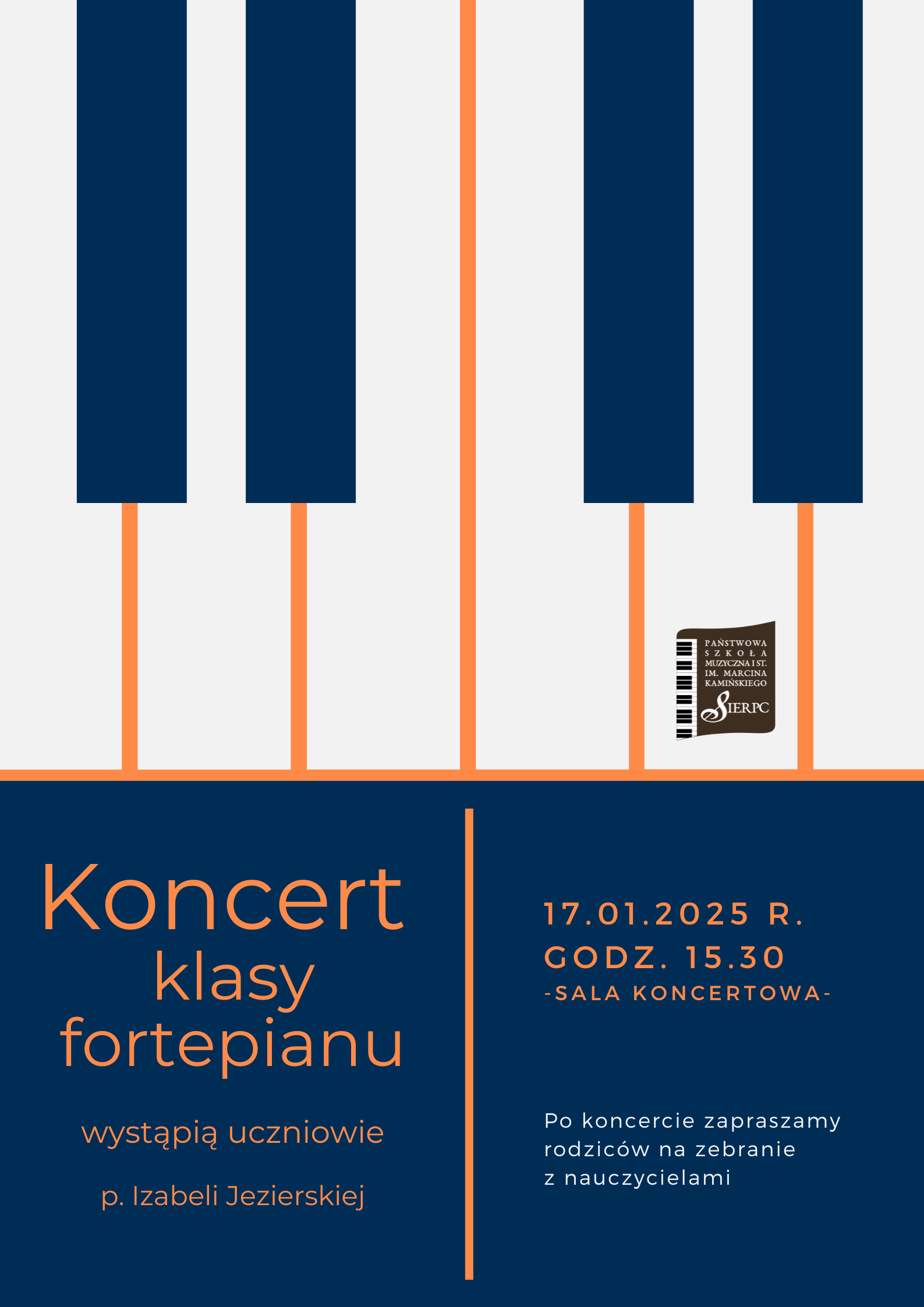 Zapraszamy na Koncert w wykonaniu uczniów klasy fortepianu Pani Izabeli Jezierskiej, który odbędzie się 17.01.2025 r. o godzinie 15.30 w sali koncertowej.