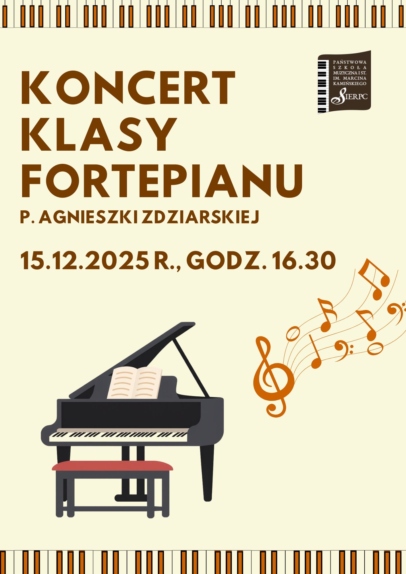 Dnia 15.12.2025 r. o godzinie 16.30 zapraszamy na Koncert klasy fortepianu uczniów p. Agnieszki Zdziarskiej.