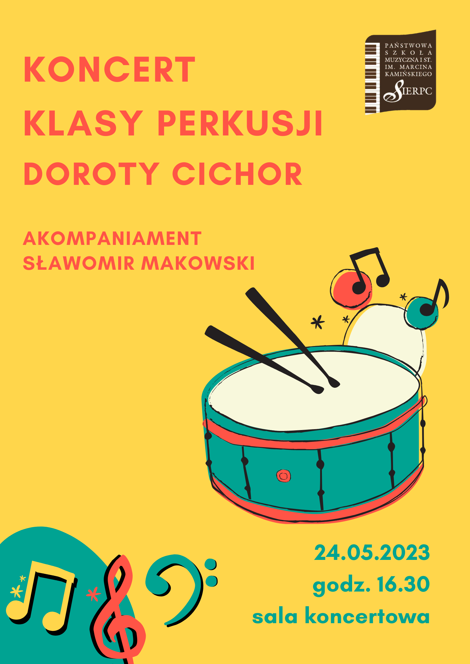 24.05.2023 r. o godz. 16.30 zapraszamy serdecznie na koncert klasy perkusji Pani Doroty Cichor.