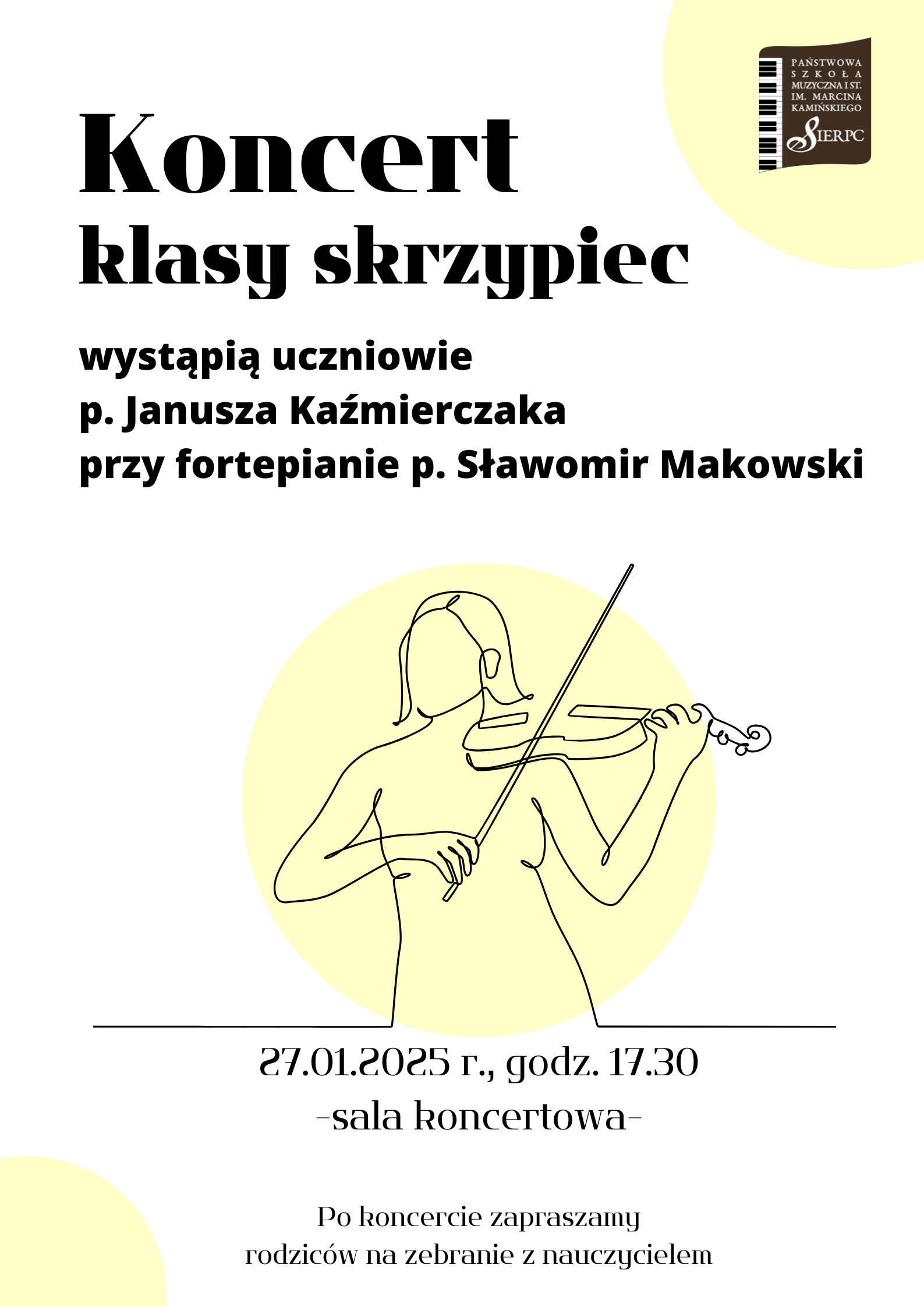 Zapraszamy na Koncert w wykonaniu uczniów klasy skrzypiec Pana Janusza Kaźmierczaka, który odbędzie się 27.01.2025 r. o godzinie 17.30 w sali koncertowej.