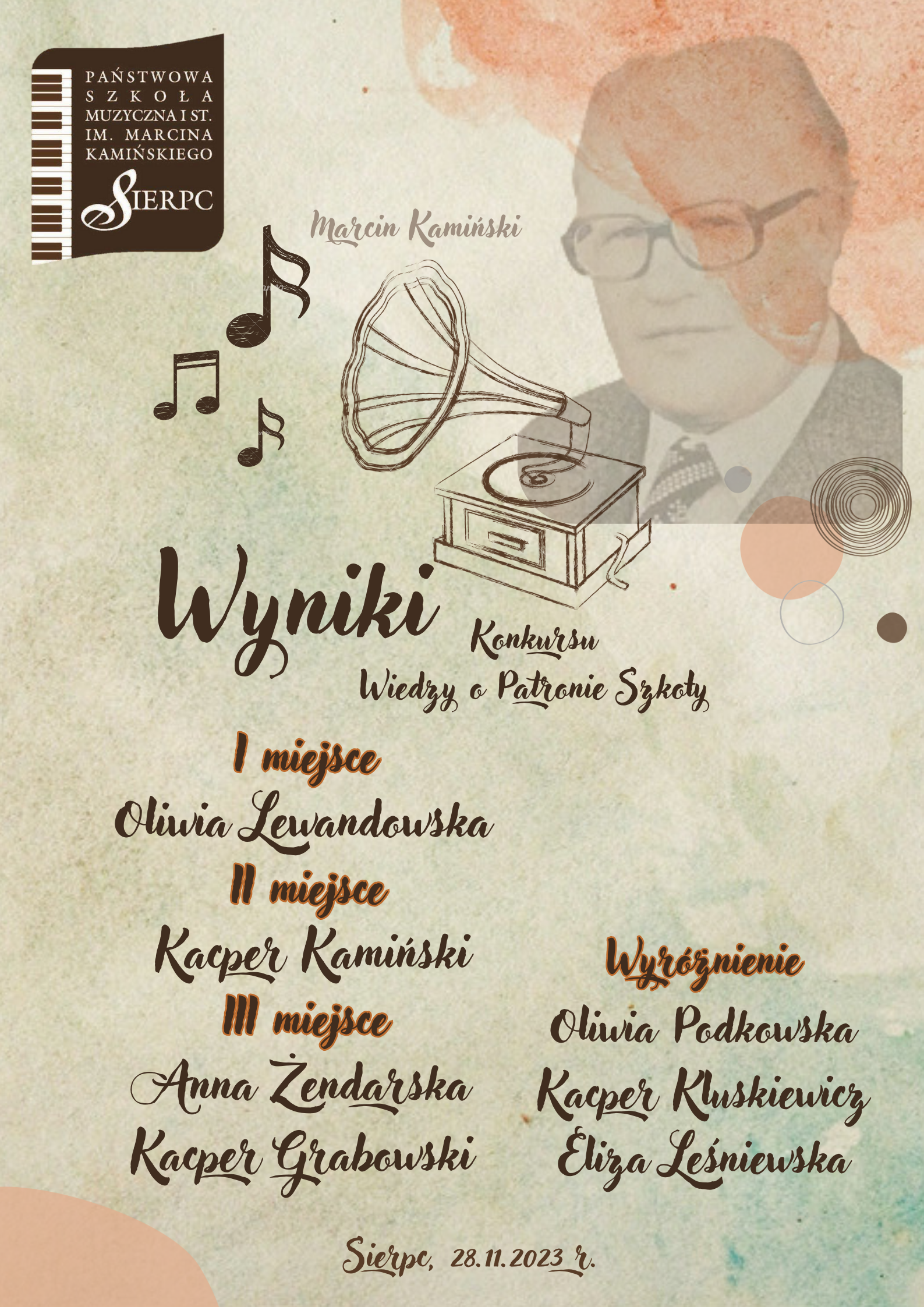 Gratulujemy wszystkim uczniom, którzy wzięli udział w Konkursie Wiedzy o Patronie Szkoły, a szczególnie nagrodzonym i wyróżnionym: Oliwii Lewandowskiej, Kacprowi Kamińskiemu, Annie Żendarskiej, Kacprowi Grabowskiemu oraz Oliwii Podkowskiej, Kacprowi Kluskiewiczowi i Elizie Leśniewskiej.