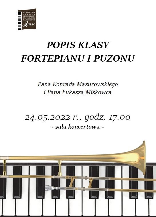 24.05.2022 r. o godzinie 17.00 w sali koncertowej Państwowej Szkoły Muzycznej I st. w Sierpcu odbędzie się popis uczniów klasy fortepianu Pana Konrada Mazurowskiego oraz uczniów klasy puzonu Pana Łukasza Miśkowca.