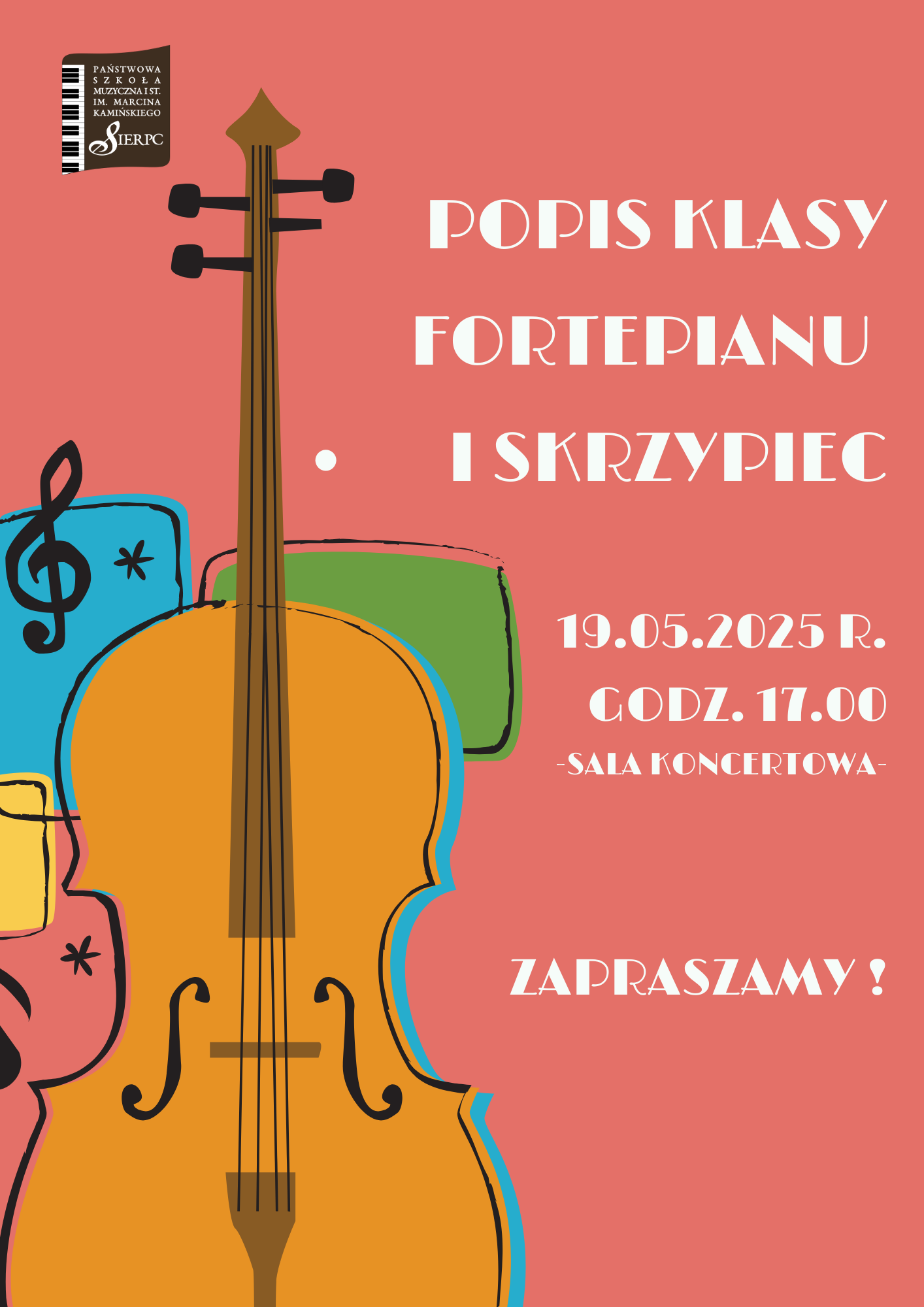 Zapraszamy na popis uczniów klasy fortepianu Pani Agnieszki Zdziarskiej oraz uczniów klasy skrzypiec Pana Janusza Kaźmierczaka, który odbędzie się 19.05.2025 r. o godzinie 17.00 w sali koncertowej.