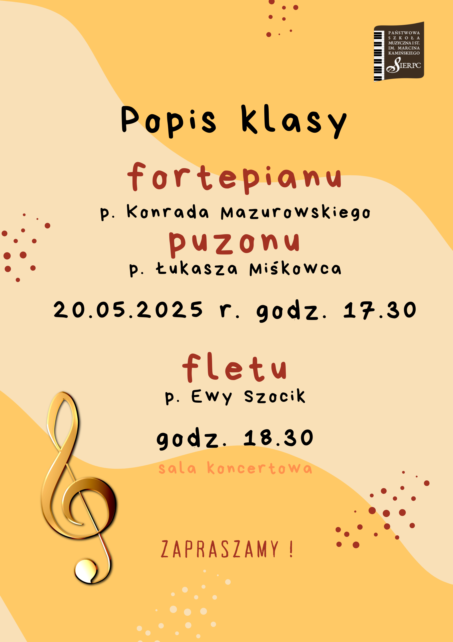 Zapraszamy na popis uczniów klasy fortepianu Pana Konrada Mazurowskiego, popis uczniów klasy puzonu Pana Łukasza Miśkowca, który odbędzie się 20.05.2025 r. o godzinie 17.30 oraz popis uczniów klasy skrzypiec Pani Ewy Szocik, który odbędzie się o godzinie 18.30 w sali koncertowej.