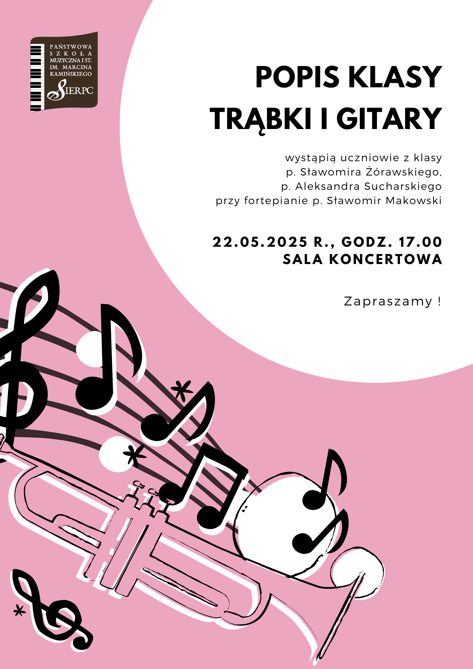 Zapraszamy na popis uczniów klasy trąbki Pana Sławomira Żórawskiego oraz popis uczniów klasy gitary Pana Aleksandra Sucharskiego, który odbędzie się 22.05.2025 r. o godzinie 17.00 w sali koncertowej.