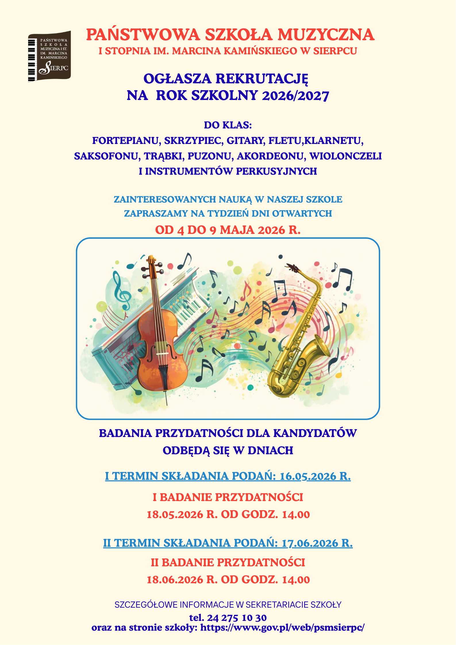 Dyrektor Państwowej Szkoły Muzycznej I stopnia im. Marcina Kamińskiego w Sierpcu ogłasza zapisy dzieci i młodzieży chętnych do nauki gry na instrumentach w następujących specjalnościach: fortepian, skrzypce, gitara, flet, klarnet, saksofon, trąbka, puzon, akordeon, wiolonczela, instrumenty perkusyjne.