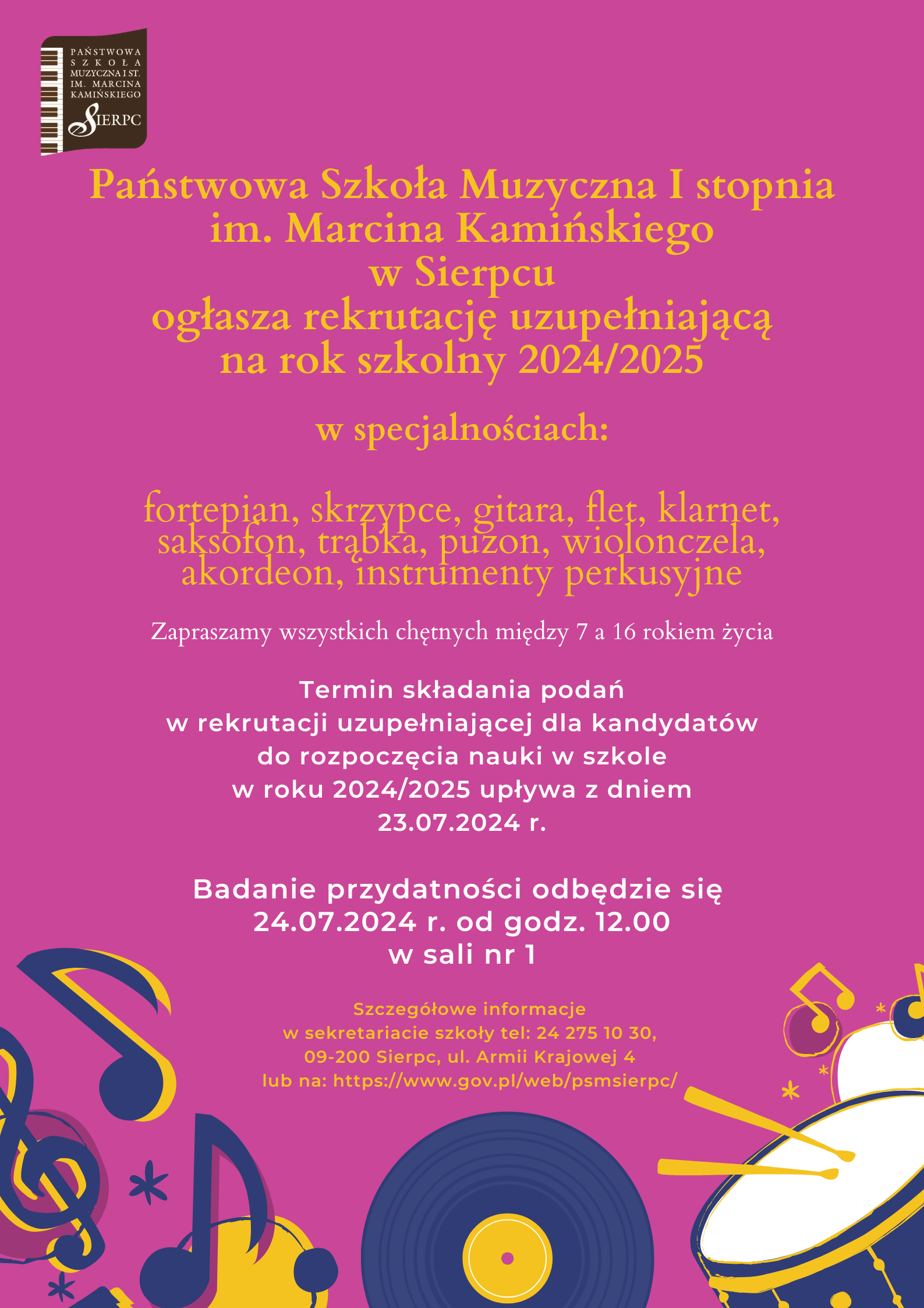 Państwowa Szkoła Muzyczna I stopnia im. Marcina Kamińskiego w Sierpcu ogłasza rekrutację uzupełniającą na rok szkolny 2024/2025 w specjalnościach: