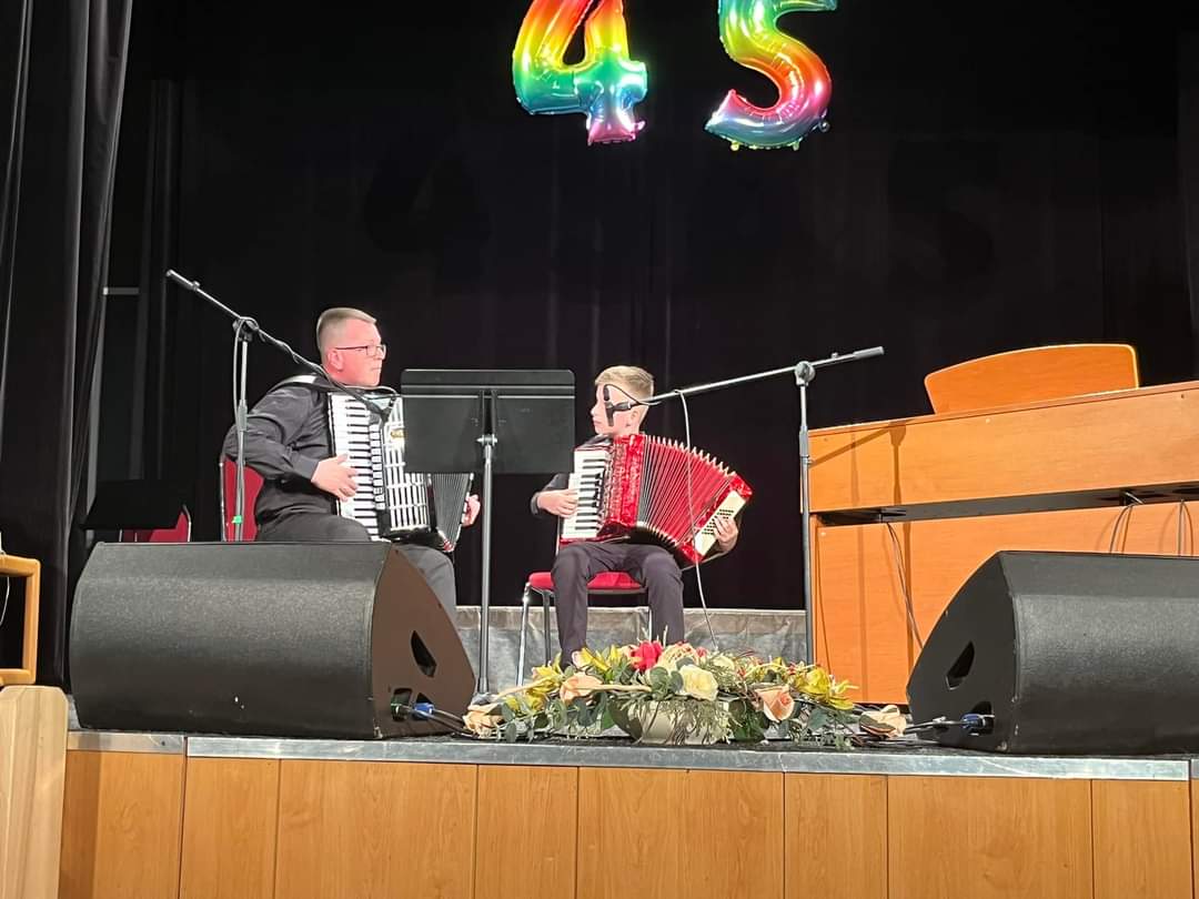 Głównym punktem spotkania był uroczysty Koncert z okazji jubileuszu naszych Gospodarzy, który odbył się w Miejskim Centrum Kultury w Hulinie w piątek 26 maja. Naszą Szkołę na Koncercie reprezentowali uczniowie: Kalina Kośmider i Julia Krzemińska z klasy fletu p. Ewy Szocik, Oliwia Lewandowska z klasy gitary p. Aleksandra Sucharskiego, Adam Leśniewski z klasy trąbki p. Sławomira Żórawskiego, Maciej Graczykowski z klasy puzonu p. Łukasza Miśkowca, Jakub Brzeziński z klasy saksofonu p. Andrzeja Wojtasa, Franciszek Watkowski z klasy perkusji p. Doroty Cichor oraz Jakub Wojtas i Jan Domański z klasy akordeonu p. Grzegorza Domańskiego. Rolę akompaniatorów pełnili panowie Andrzej Wojtas i Grzegorz Domański.