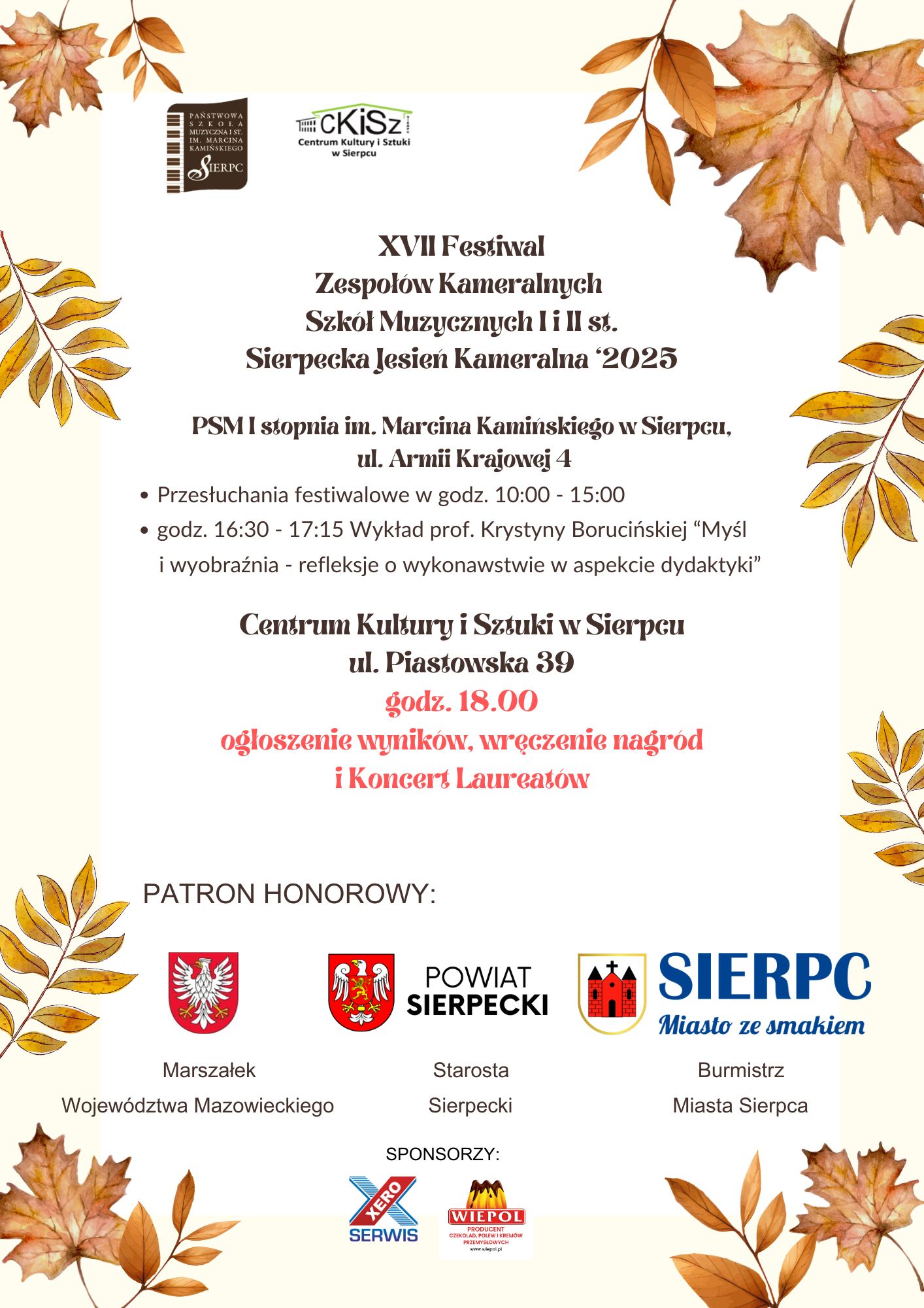 Sponsorami Sierpeckiej Jesieni Kameralnej byli: Xeroserwis, Wiepol oraz Alicja i Edmund Szpanowscy, a także Kwiaciarnia A.M. Brodzińscy.