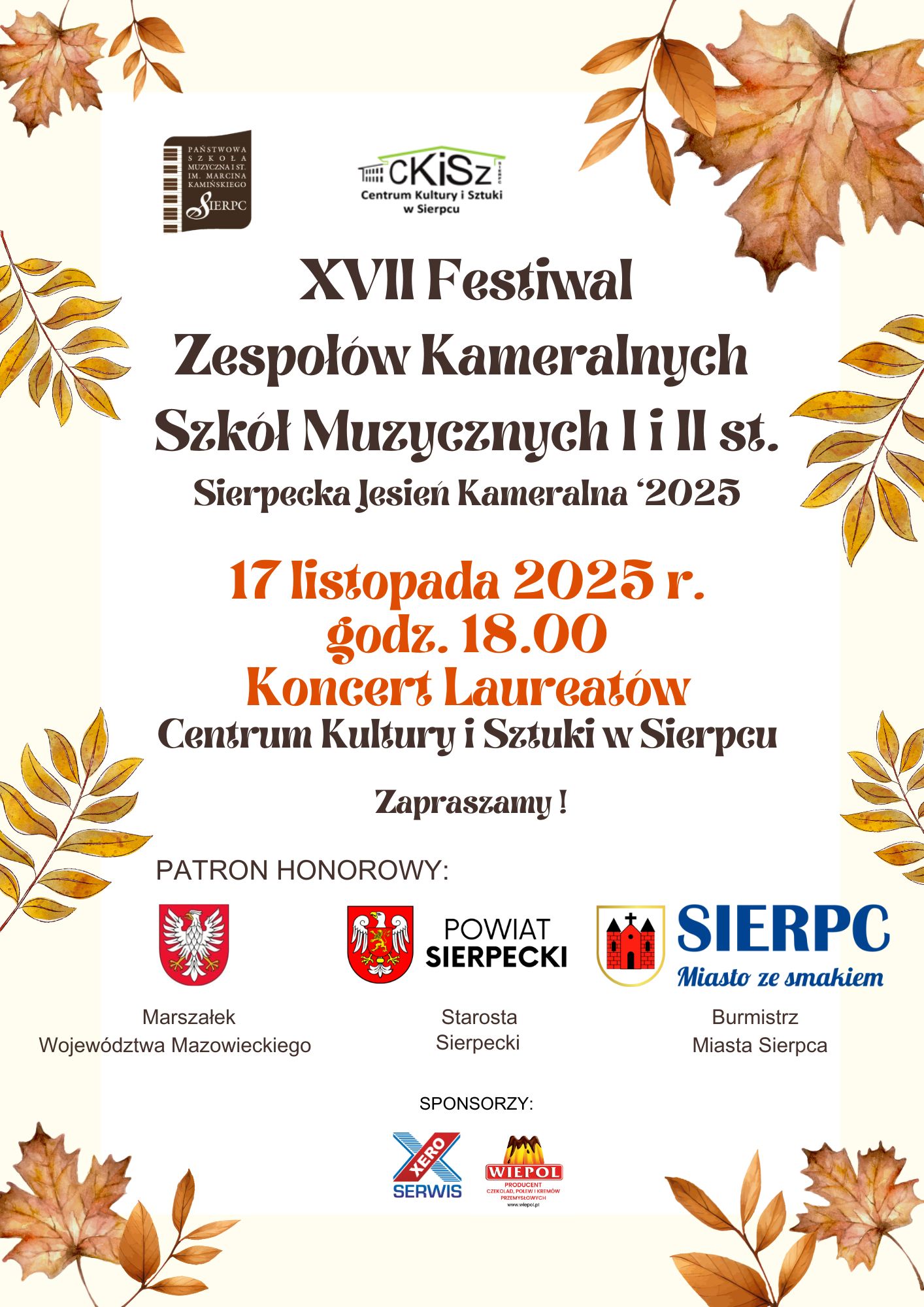 W dniu 17 listopada 2025 roku odbyła się XVII Festiwal Zespołów Kameralnych Szkół Muzycznych I i II stopnia – Sierpecka Jesień Kameralna ’2025.