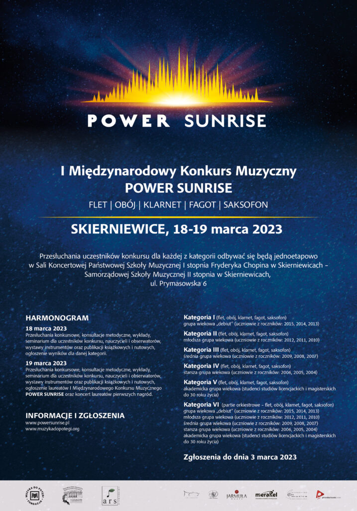 W dniach 18-19 marca 2023 w Szkole Muzycznej w Skierniewicach odbył się I Międzynarodowy Konkurs Muzyczny „POWER SUNRISE”, przeznaczony dla uczniów i studentów grających na instrumentach dętych drewnianych (flet, obój, klarnet, fagot, saksofon). W konkursie wzięło udział 106 uczestników, wśród których, w gronie laureatów znalazła się uczennica Państwowej Szkoły Muzycznej I stopnia im. Fryderyka Chopina w Skierniewicach Zofia Stokwisz zdobywczyni III Nagrody. Wszystkich uczestników słuchało i oceniało Jury w składzie: