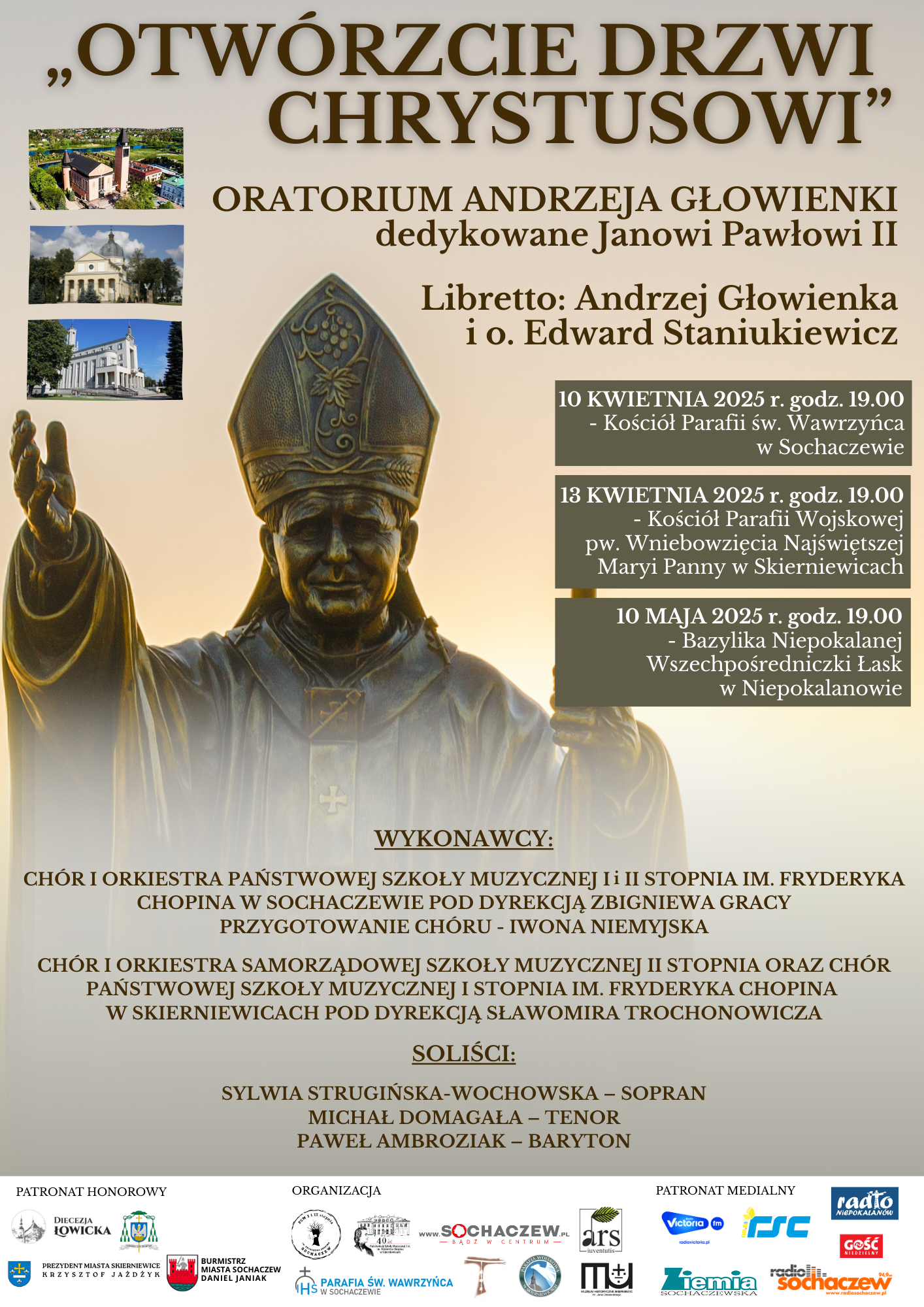 Państwowa Szkoła Muzyczna I i II stopnia im. Fryderyka Chopina w Sochaczewie, Państwowa Szkoła Muzyczna I stopnia im. Fryderyka Chopina w Skierniewicach oraz Samorządowa Szkoła Muzyczna II stopnia w Skierniewicach zapraszają na koncerty w ramach projektu „Oratorium Jubileuszowego Szkół Muzycznych”. Szkoły te w roku szkolnym 2024/2025 obchodzą swoje jubileusze istnienia co stało się doskonałą okazją do nawiązania współpracy i zrealizowania koncertów, podczas których usłyszymy dedykowane Janowi Pawłowi II oratorium „Otwórzcie Drzwi Chrystusowi”. Kompozytorem tego utworu jest Andrzej Głowienka. Libretto oparte na życiu św. Jana Pawła II powstało we współpracy Andrzeja Głowienki i o. Edwarda Staniukiewicza.