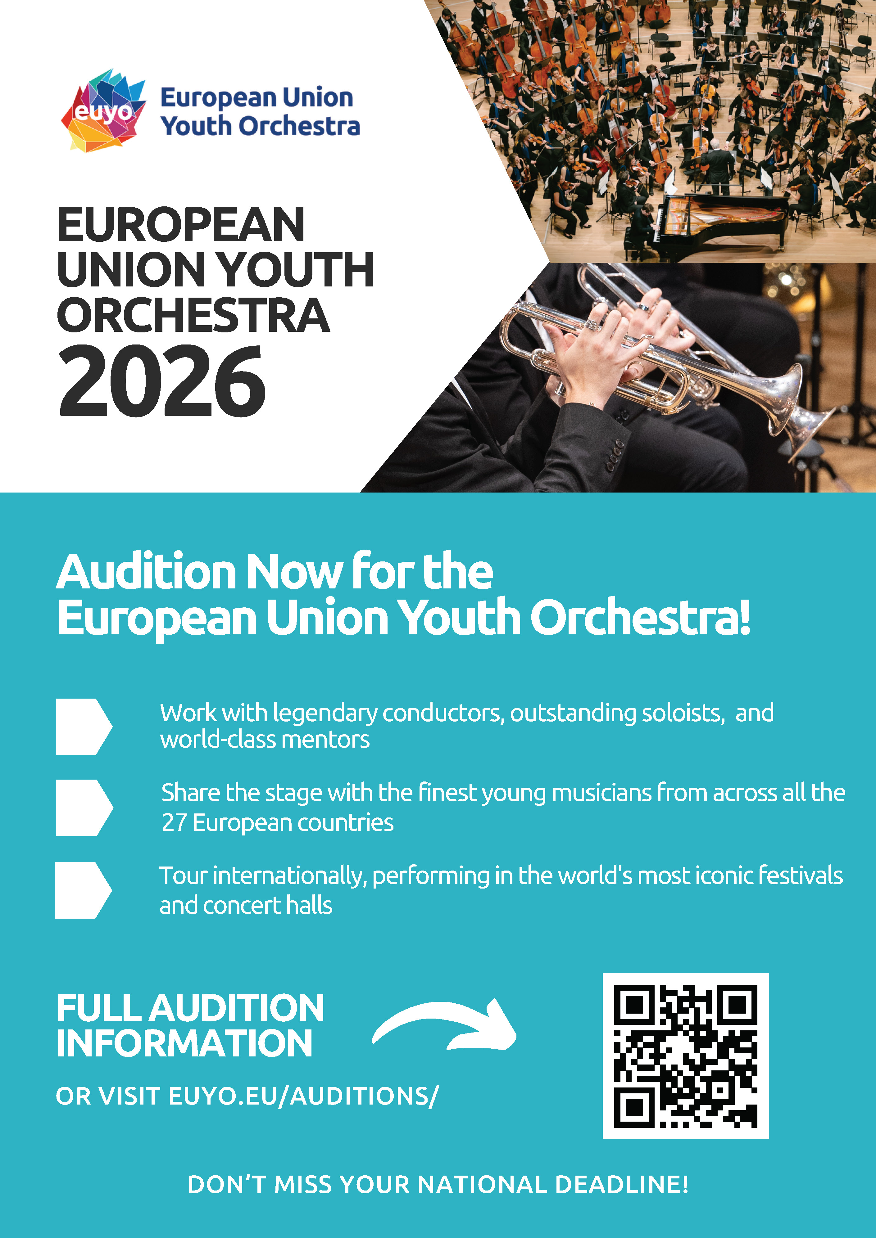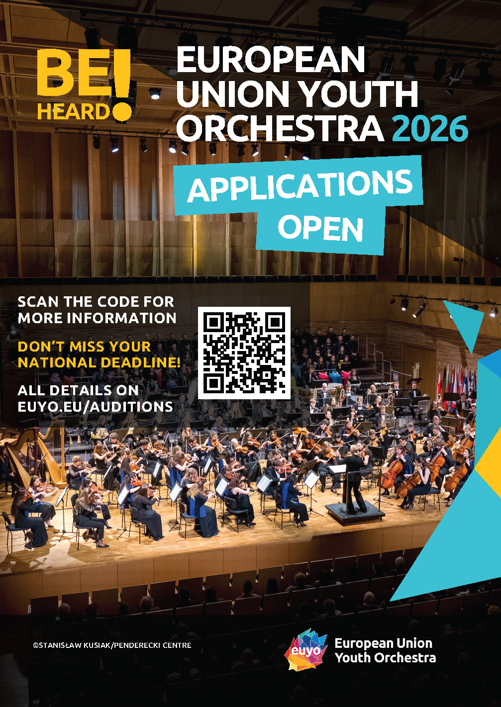 Szczegółowe informacje w sprawie przesłuchań (zasady uczestnictwa, lista instrumentów dopuszczonych do przesłuchań, wymagania repertuarowe, orkiestrówki itd.), a także formularz zgłoszeniowy, znajdują się na stronie internetowej EUYO (KLIKNIJ TUTAJ).