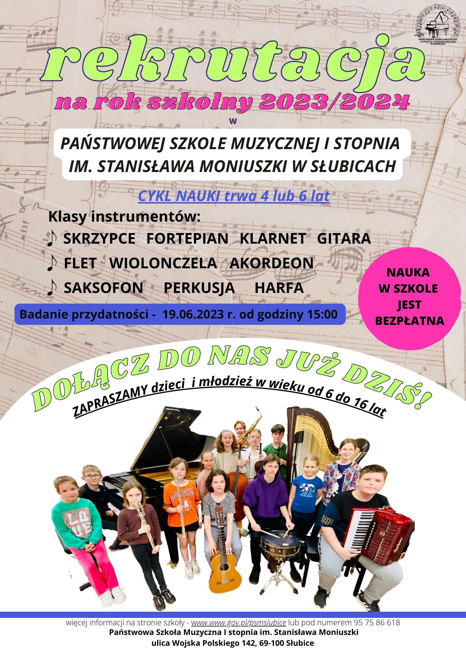 Na podstawie badania przydatności komisja kwalifikacyjna wydała decyzję o przyjęciu kandydatów do kształcenia muzycznego w Państwowej Szkole Muzycznej I stopnia im. Stanisława Moniuszki w Słubicach w roku szkolnym 2023/2024. Treść decyzji znajduje się w sekretariacie szkoły.