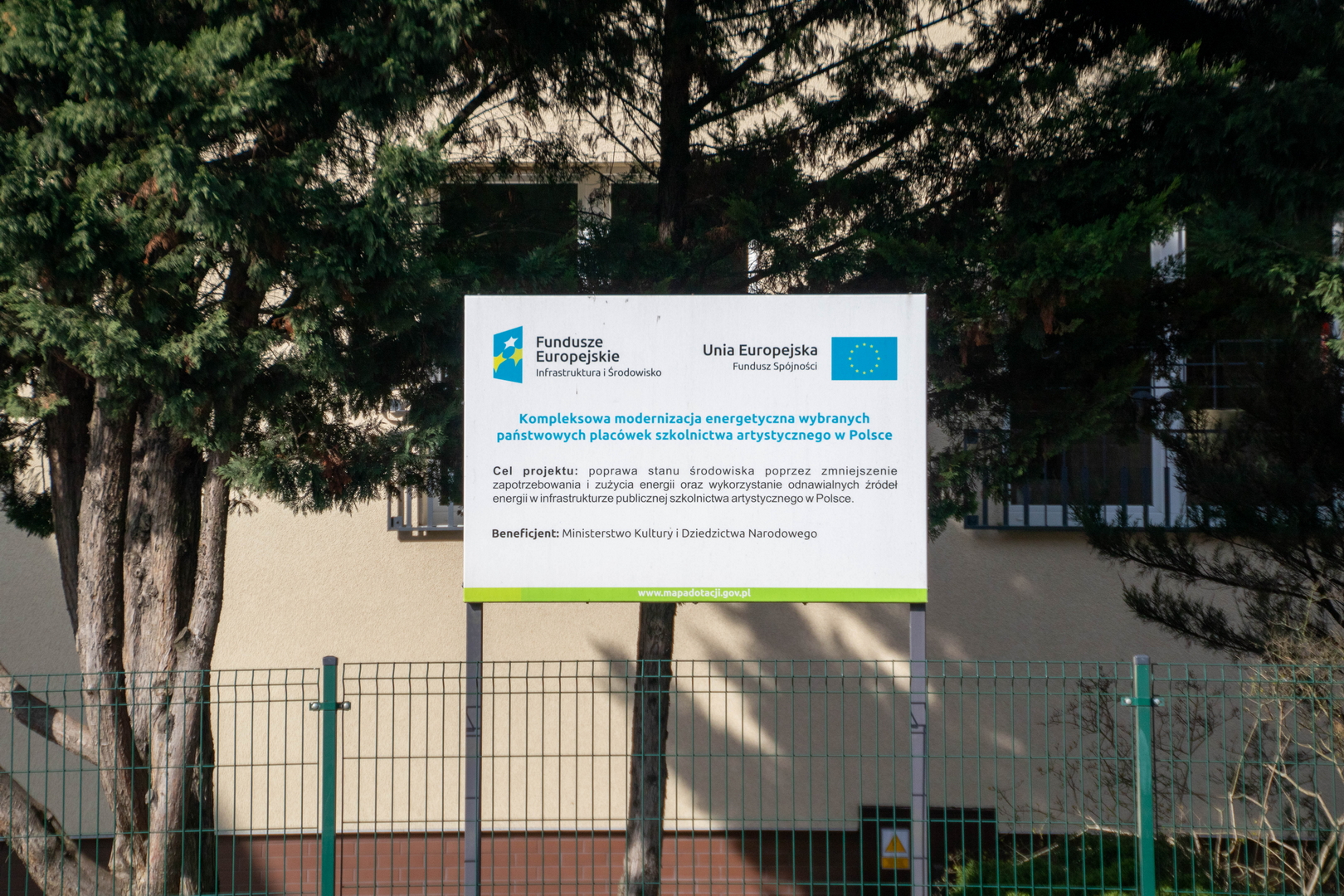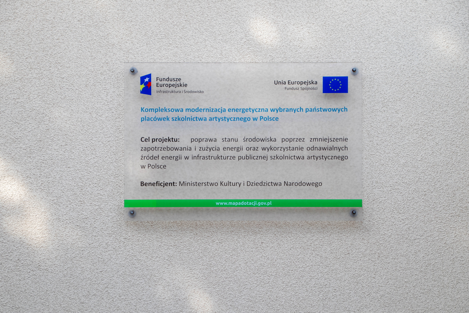 Budynek naszej placówki został objęty projektem pn. "Kompleksowa modernizacja energetyczna wybranych państwowych placówek szkolnictwa artystycznego w Polsce, który jest finansowany ze środków Unii Europejskiej (Funduszu Spójności) w ramach Programu Operacyjnego Infrastruktura i Środowisko 2014-2020 oraz środków MKiDN - budżetu państwa.