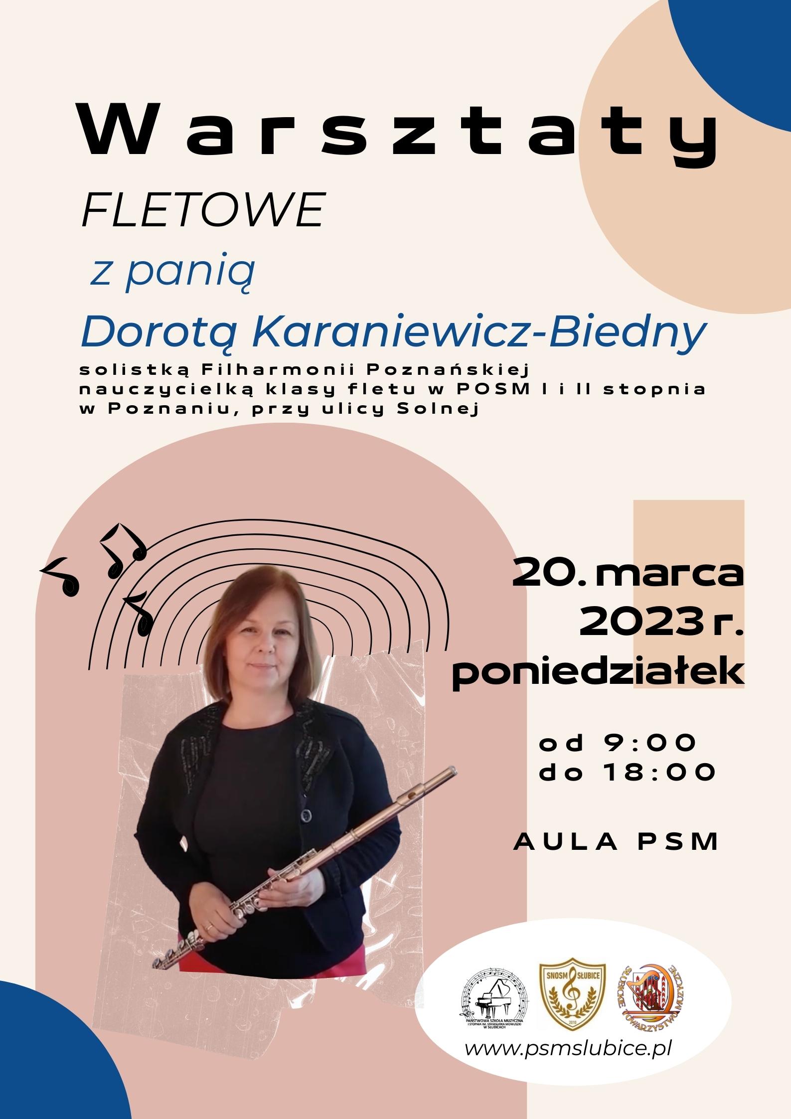 Do Słubic przyjedzie utytułowana pedagog - mgr Dorota Karaniewicz-Biedny, na co dzień pracująca w Filharmonii Poznańskiej oraz prowadząca klasę fletu w Poznańskiej Ogólnokształcącej Szkole Muzycznej I stopnia im. Henryka Wieniawskiego w Poznaniu oraz Poznańskiej Ogólnokształcącej Szkole Muzycznej II stopnia im. Mieczysława Karłowicza w Poznaniu. Spotanie muzyczne z panią Dorotą Karaniewicz-Biedny odbywać się będzie w auli Państwowej Szkoły Muzycznej od godziny 9:00 do 18:30. Na wstępie zaproszony Gość wygłosi referat dla młodych flecistów a następnie poprowadzi indywidualne 30 i 45 minutowe lekcje (WK).