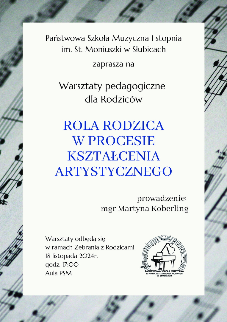 Państwowa Szkoła Muzyczna I stopnia im. Stanisława Moniuszki w Słubicach serdecznie zaprasza wszystkich Rodziców uczniów na spotkanie z mgr Martyną Koberling, które odbędzie się 18 listopada 2024 roku o godzinie 17:00 w Auli Szkoły.