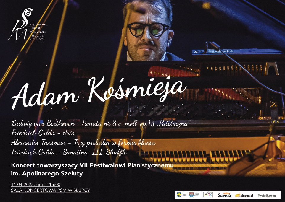 Recital fortepianowy Adama Kośmieja odbył się 11 kwietnia o godz. 15.00 na sali koncertowej podczas uroczystości zakończenia Festiwalu Pianistycznego im. Apolinarego Szeluty.