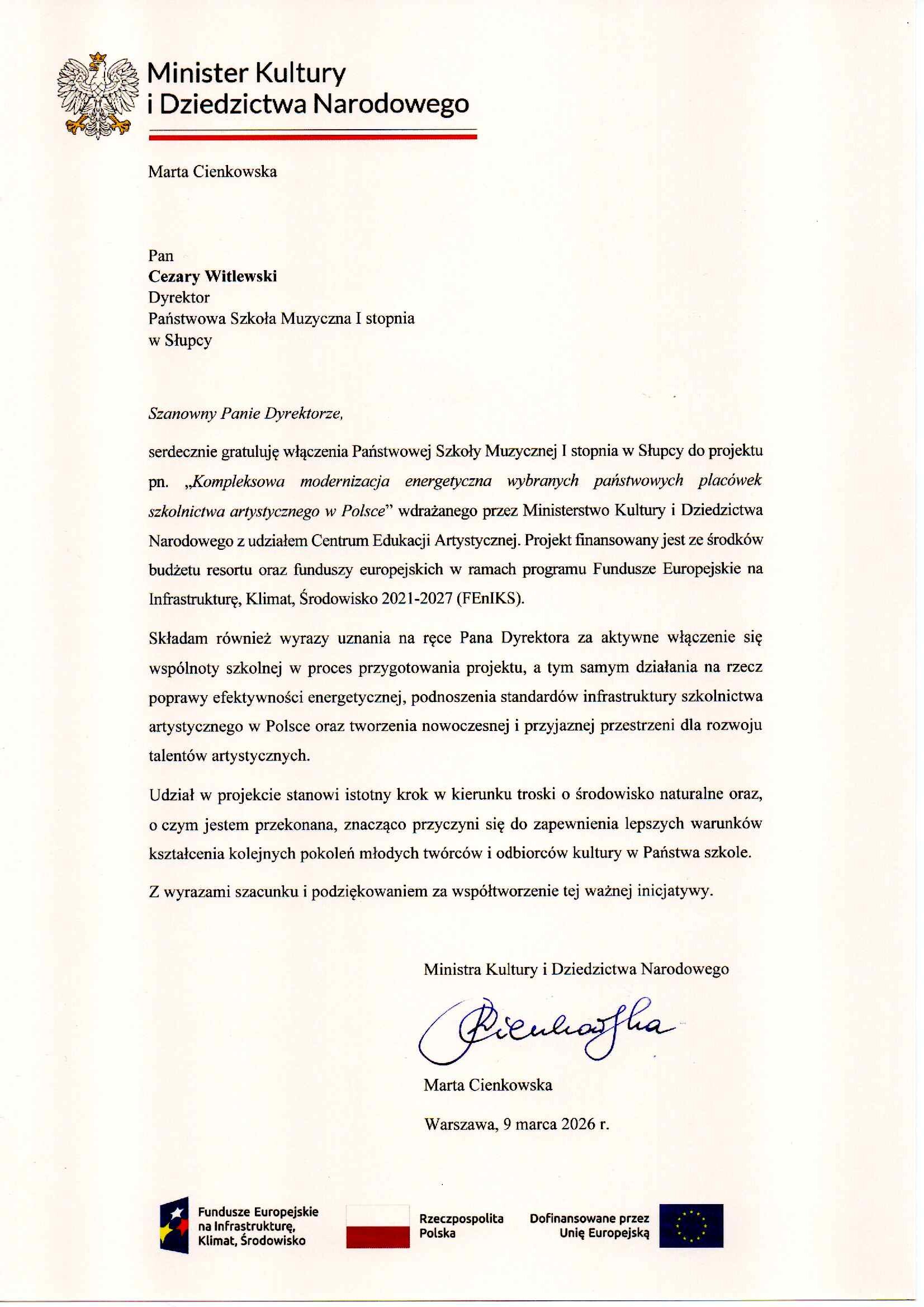 Trzeci etap projektu pn. „Kompleksowa modernizacja energetyczna wybranych państwowych placówek szkolnictwa artystycznego w Polsce” obejmie 33 budynki (w 31 lokalizacjach) należące do 29 placówek szkolnictwa artystycznego. Realizacja potrwa do 2029 roku, a całkowity koszt wyniesie 120,75 mln zł. Przedsięwzięcie zostanie sfinansowane ze środków Unii Europejskiej – w ramach Programu Fundusze Europejskie na Infrastrukturę, Klimat i Środowisko (69,99 mln zł) – oraz Ministerstwa Kultury i Dziedzictwa Narodowego. Celem projektu jest m.in. poprawa standardów funkcjonowania szkół artystycznych