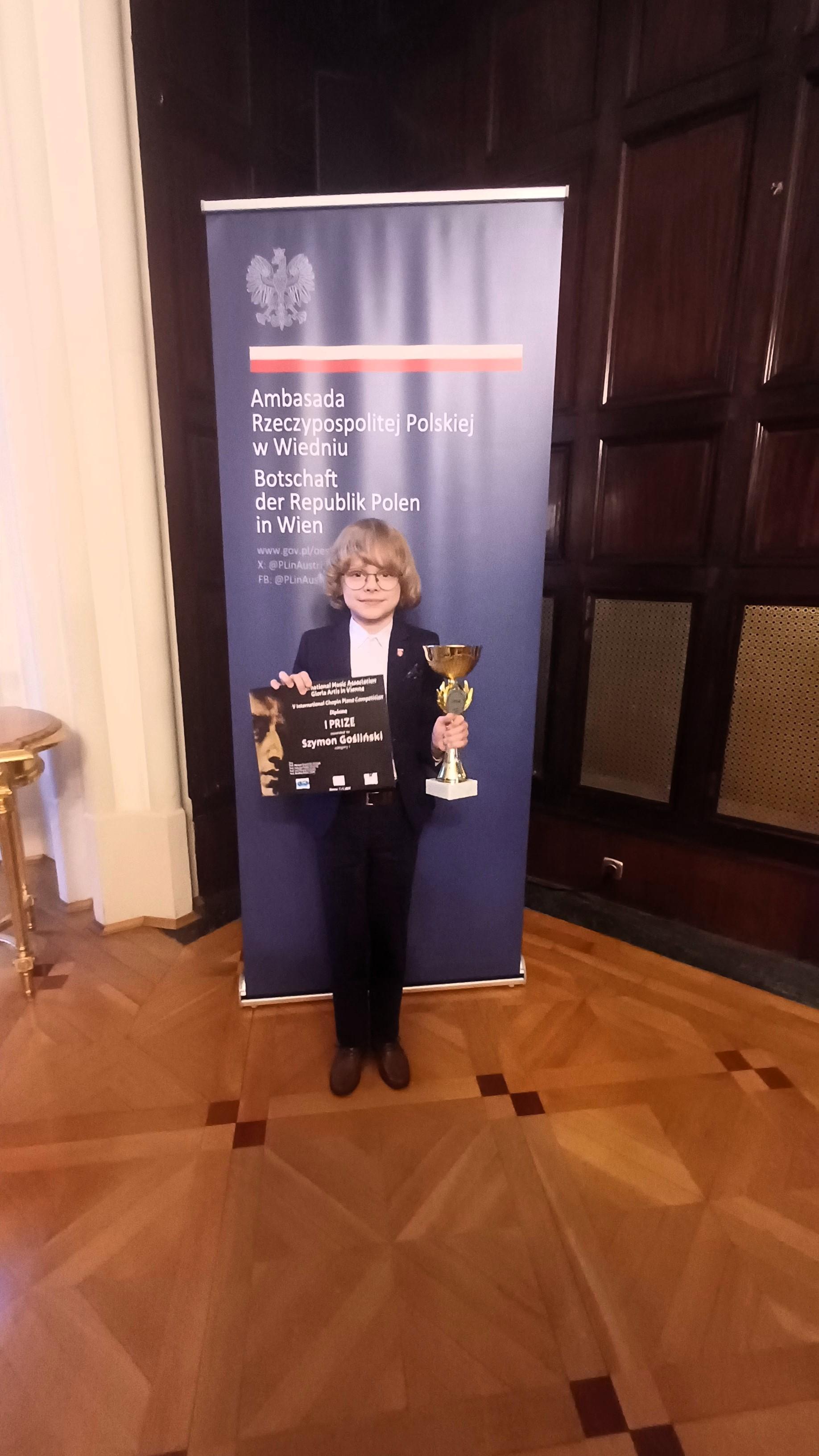 Uczeń naszej szkoły - Szymon Gośliński wystąpił 8 maja na III Międzynarodowym Festiwalu Gloria Artis Talents w ambasadzie Polski w Wiedniu. Na festiwalu można było usłyszeć najzdolniejszych młodych muzyków z Japonii, Tajwanu, Chin i Polski.