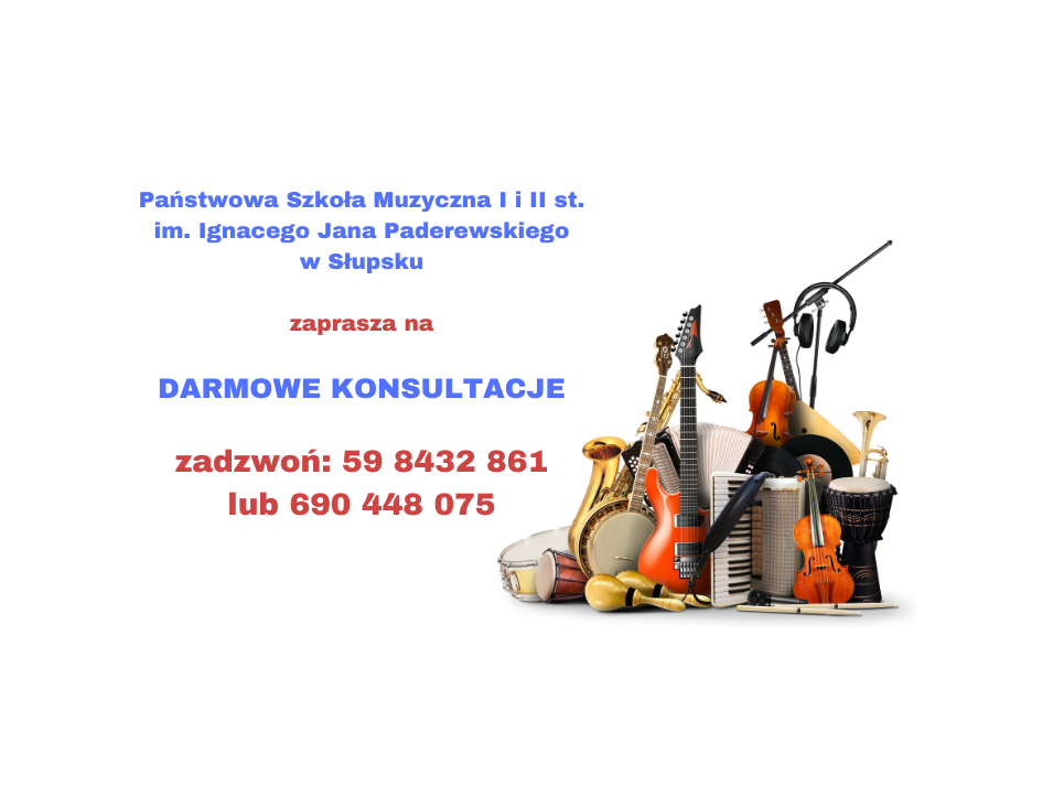Darmowe konsultacje 06.04.2023 Państwowa Szkoła Muzyczna I i II st. im. Ignacego Jana Paderewskiego w Słupsku zaprasza na DARMOWE KONSULTACJE Zadzwoń: 598432861 lub 690448075 Zdjęcia (1) Pokaż zdjęcie 1 z galerii.