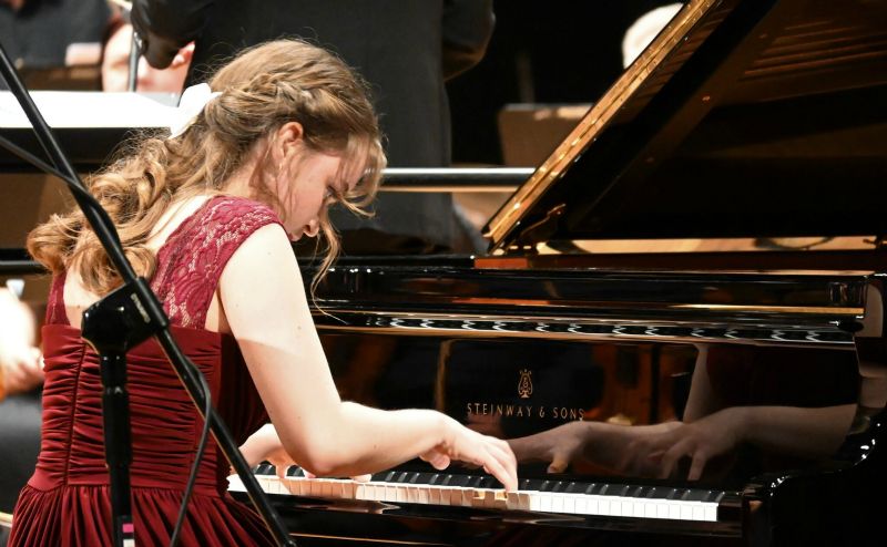 Drugą część koncertu rozpoczęła Magdalena Dzikoń - uczennica klasy VI PSM 2-go stopnia, fortepianu mgr Barbary Sąsiadek. Wykonana przez nią pierwsza część Koncertu fortepianowego d-moll, op.40 nr 2 Felixa Mendelssohna jest dla pianistów sporym wyzwaniem - zarówno pod względem technicznym, jak i muzycznym. Wyzwaniu temu Magda sprostała wspaniale elektryzując swą kreacją publiczność filharmonii.