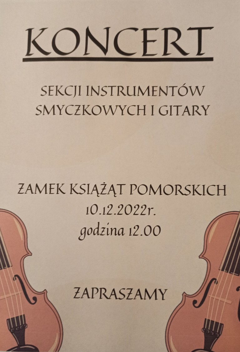 Dnia 10.12.2022r. o godz.12:00 w Zamku Książąt Pomorskich w Słupsku odbędzie się koncert w wykonaniu uczniów sekcji instrumentów smyczkowych i gitary. Zabrzmi muzyka m.in. G.F.Haendla, H.Wieniawskiego, S.Rachmaninowa, E.Elgara i M.Skoryka.