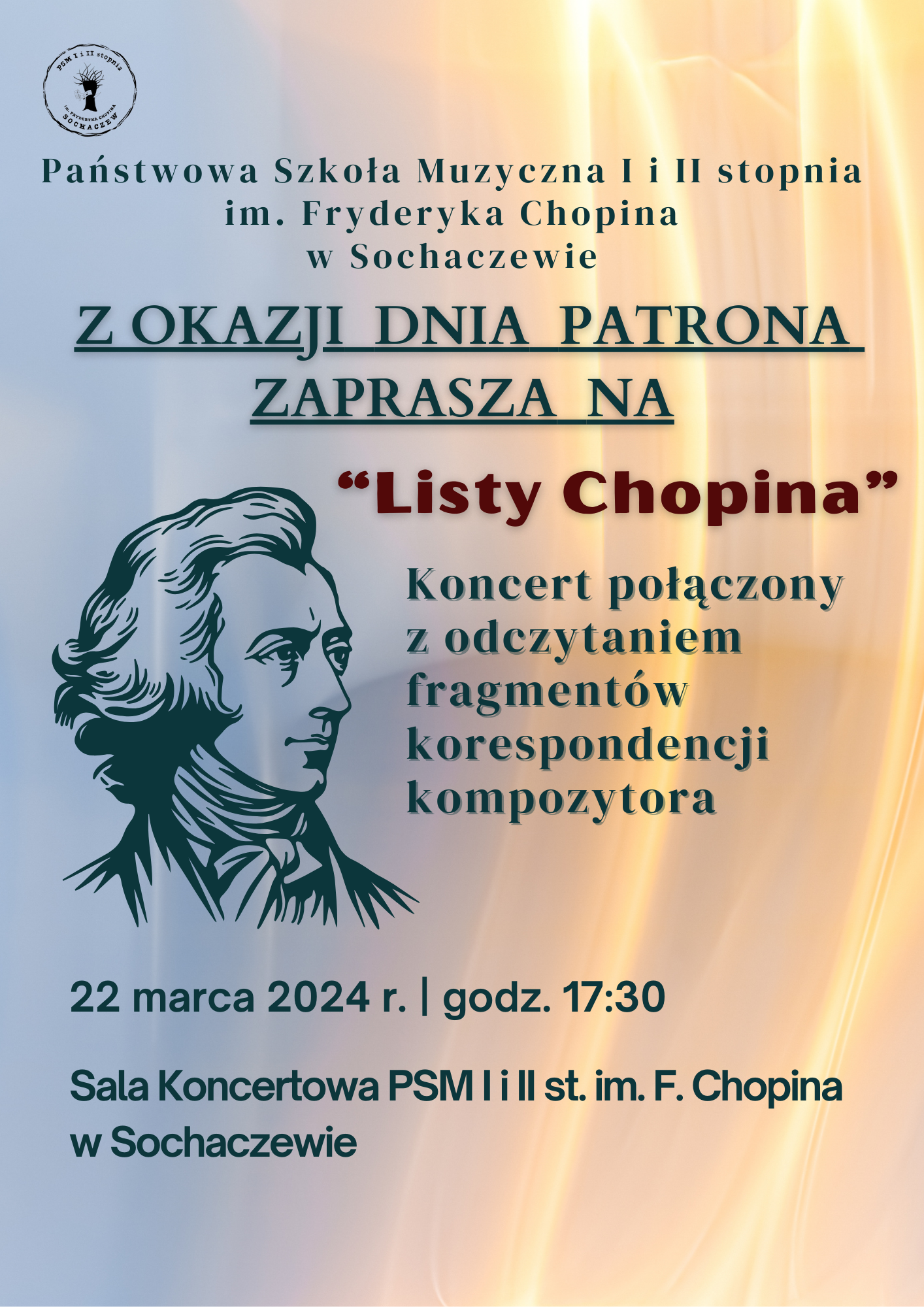 Koncert "Listy Chopina" z okazji Dnia Patrona odbędzie się 22 marca 2024 r. o godz. 17.30 w Sali Koncertowej Państwowej Szkoły Muzycznej I i II stopnia im. Fryderyka Chopina w Sochaczewie.
