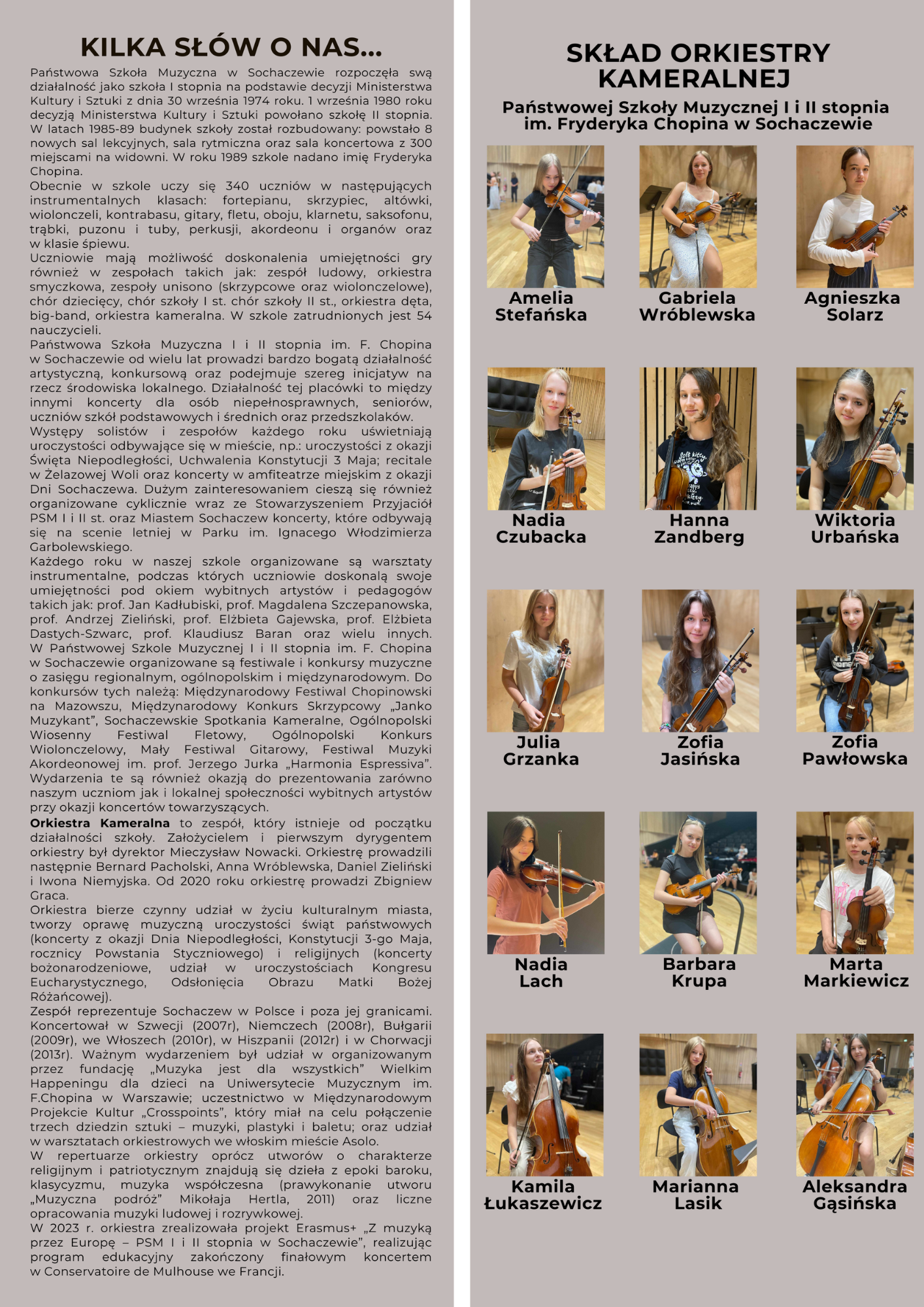 W dniach 1–12 lipca 2024 roku 26 uczniów oraz czterech nauczycieli Państwowej Szkoły Muzycznej I i II stopnia im. Fryderyka Chopina w Sochaczewie uczestniczyło w mobilności edukacyjnej w Conservatoire de Mulhouse we Francji. Przedsięwzięcie zostało w całości sfinansowane z Programu Erasmus+. Było to pierwsze tego rodzaju doświadczenie w historii szkoły. I od razu niezwykłe. Miało ono na celu rozwój zarówno umiejętności muzycznych, jak i kompetencji ogólnych uczniów.