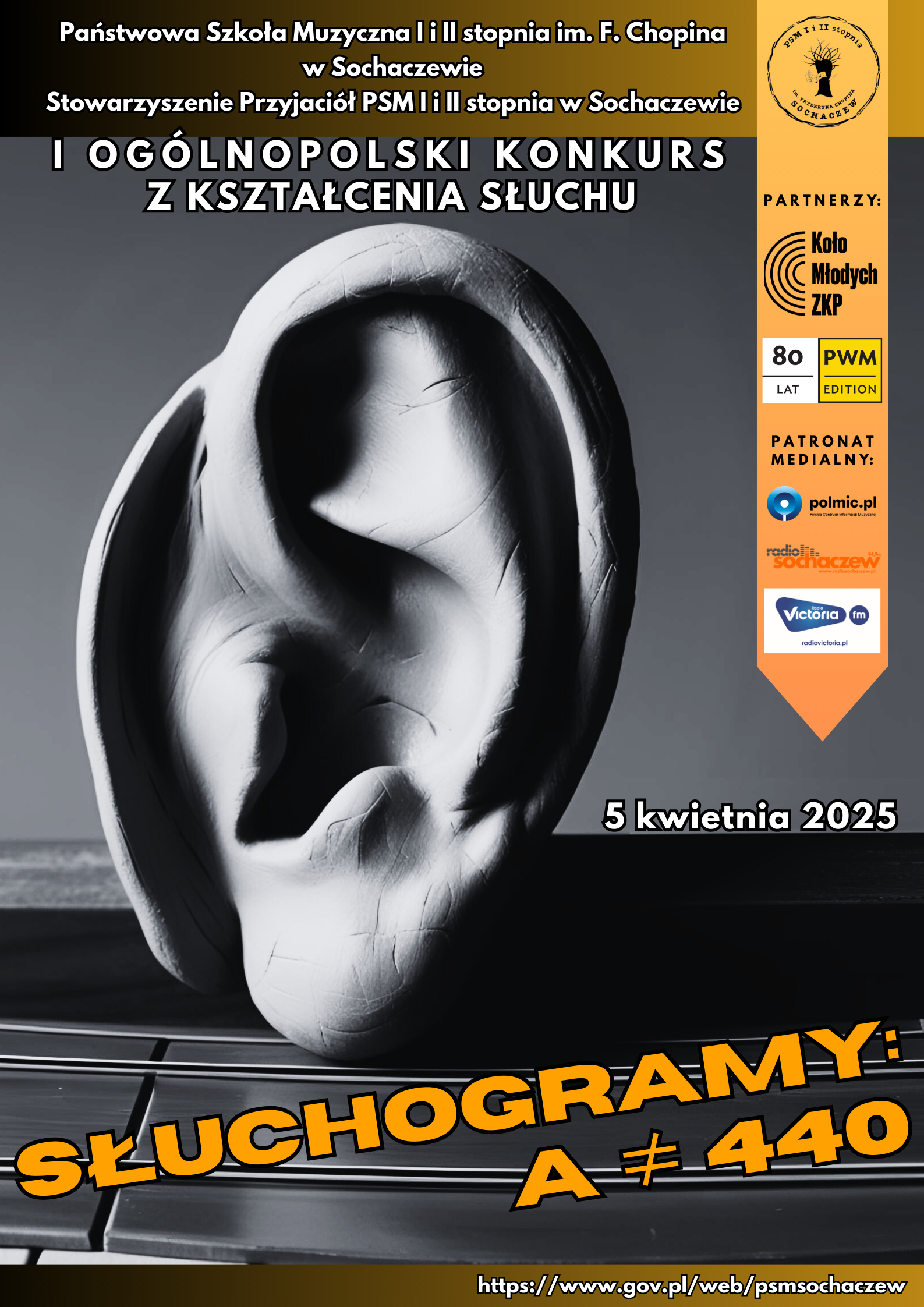 Zapraszamy na I Ogólnopolski Konkurs z Kształcenia Słuchu "Słuchogramy: A ≠ 440", który odbędzie się 5 kwietnia 2025 r. w Państwowej Szkole Muzycznej I i II stopnia im. Fryderyka Chopina w Sochaczewie. Na zgłoszenia uczestników czekamy do 24 marca 2025 r.