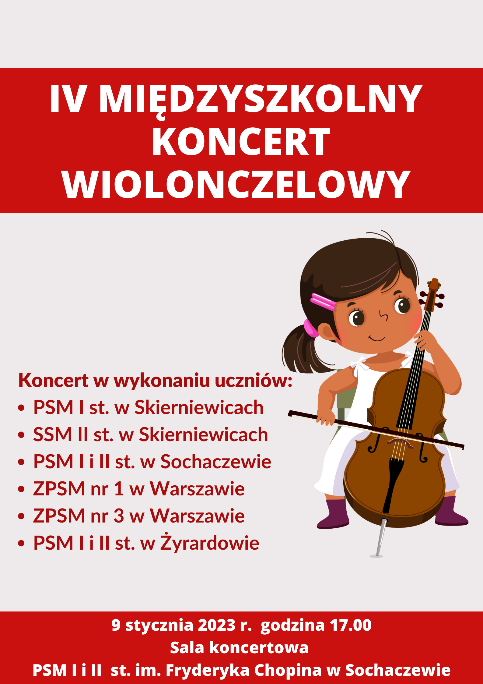 Zapraszamy na IV Międzyszkolny Koncert Wiolonczelowy w wykonaniu uczniów: PSM I st. w Skierniewicach, SSM II st. w Skierniewicach, PSM I i II st. w Sochaczewie, ZPSM nr 1 w Warszawie, ZPSM nr 3 w Warszawie oraz PSM I i II st. w Żyrardowie.