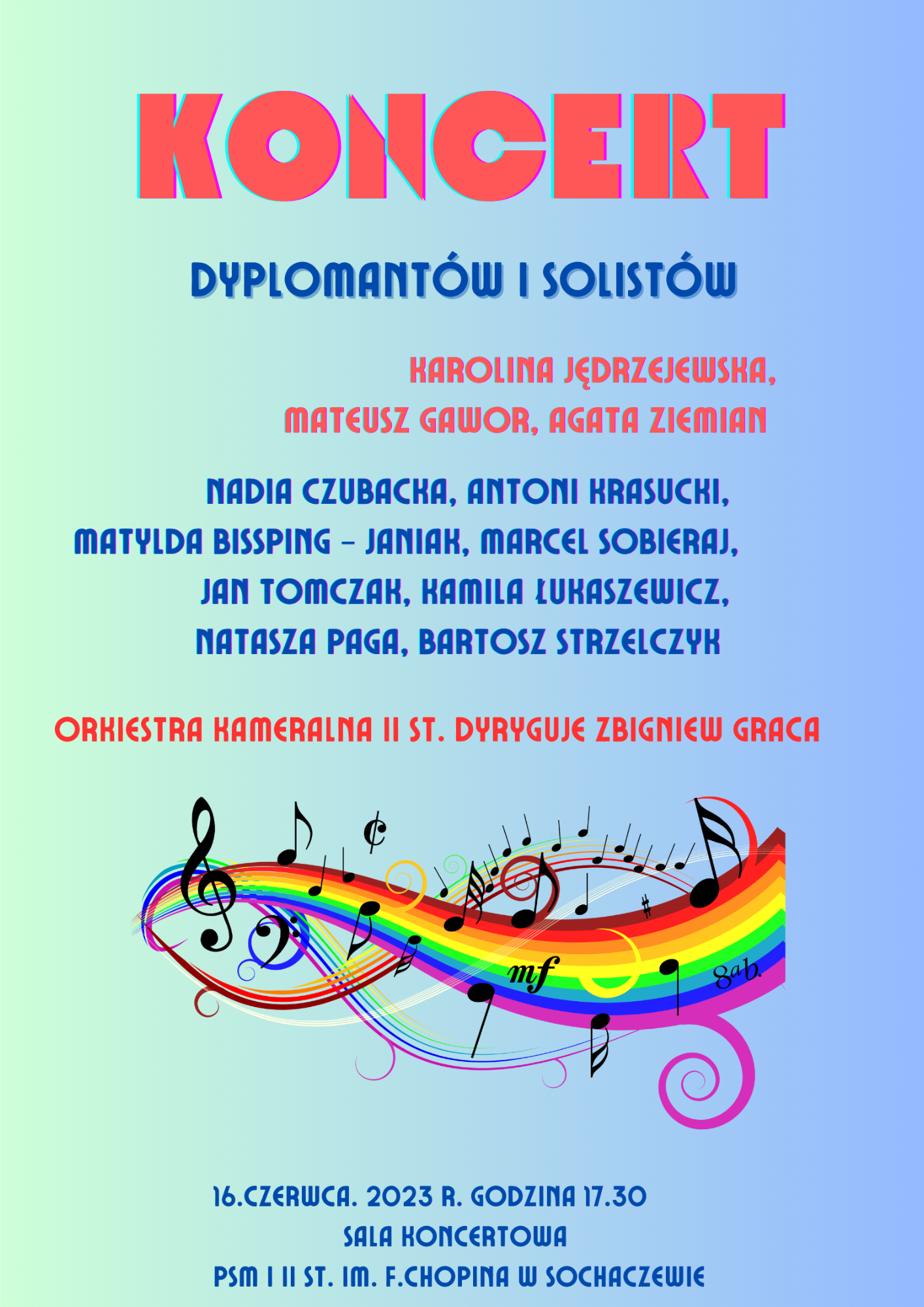 Dyplomantom towarzyszyć będzie Orkiestra Kameralna PSM I i II st. im. F. Chopina w Sochaczewie pod dyrekcją Zbigniewa Gracy.