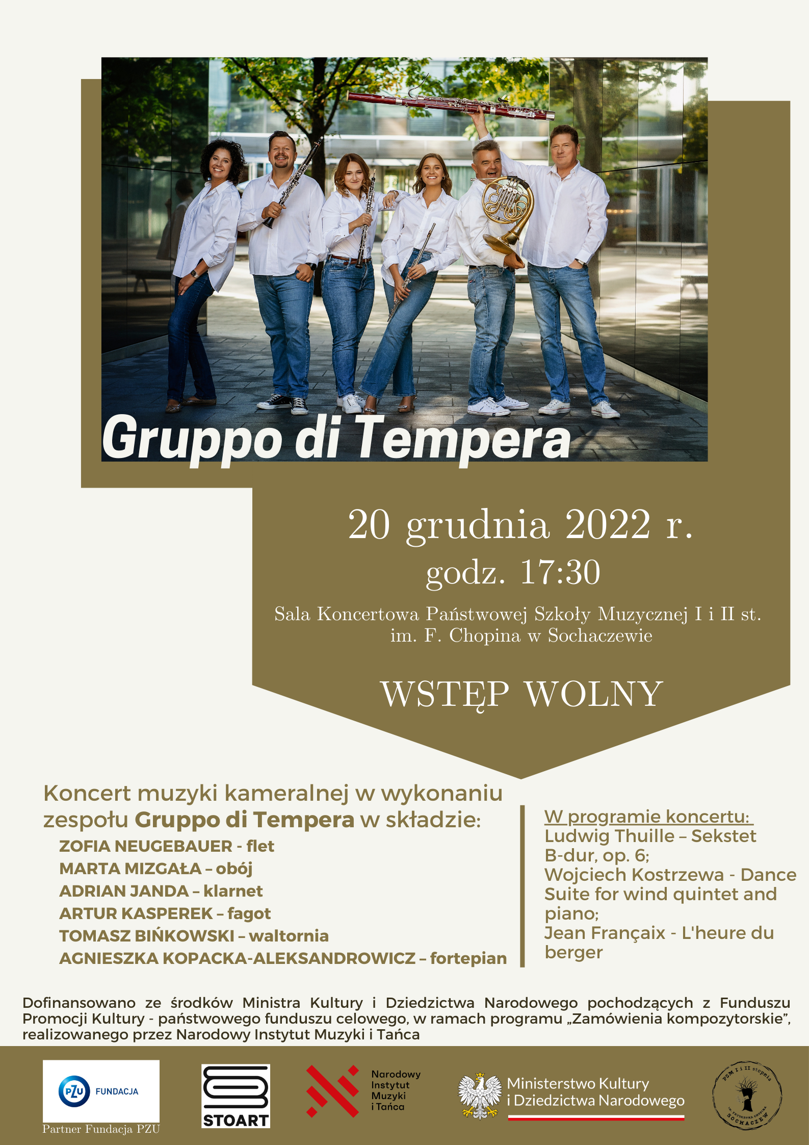 20 grudnia 2022 r. godz. 17.30. w Sali Koncertowej Państwowej Szkoły Muzycznej I i II st. im. F. Chopina w Sochaczewie odbędzie się Koncert muzyki kameralnej w wykonaniu zespołu Gruppo di Tempera w składzie: