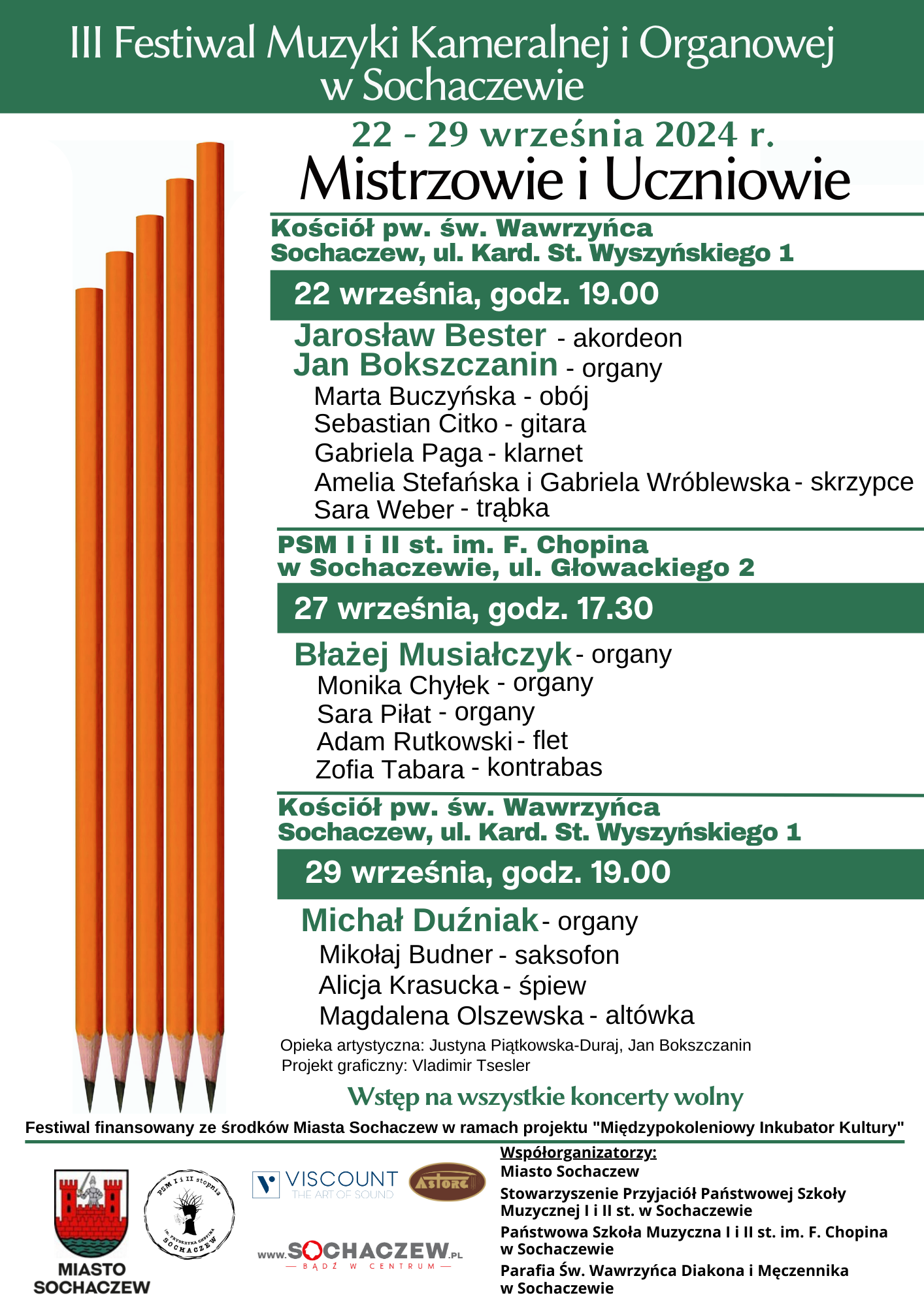 W programie Koncertu Inauguracyjnego, który odbędzie się o godz. 19.00 w najbliższą niedzielę 22 września 2024 r. w Kościele Parafii św. Wawrzyńca w Sochaczewie usłyszymy obok uznanych artystów również przedstawicieli młodego pokolenia – uczniów Państwowej Szkoły Muzycznej I i II stopnia im. Fryderyka Chopina w Sochaczewie. Tradycją tego Festiwalu jest zaangażowanie utalentowanej młodzieży z sochaczewskiej szkoły muzycznej do czynnego uczestnictwa w wydarzeniu i prezentowania swoich umiejętności, zintegrowanie pokoleń poprzez realizowanie koncertów przez mistrza i ucznia (wspólne granie uczniów i nauczycieli), propagowanie muzyki organowej w środowisku i regionie oraz wzbogacenie oferty kulturalnej Miasta i regionu.