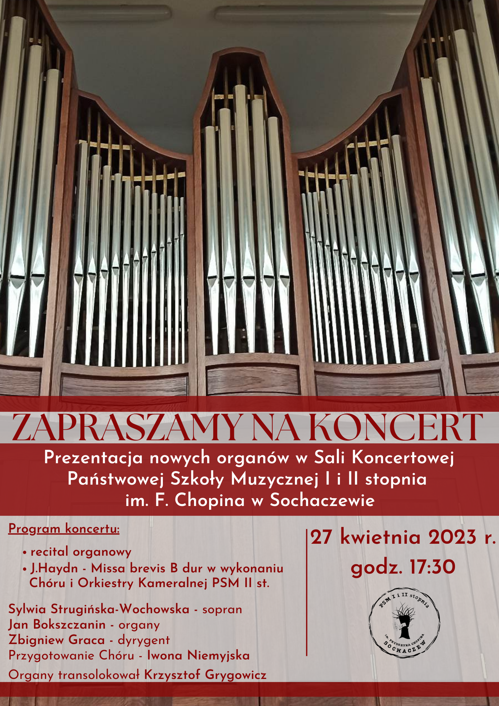 Zapraszamy na niepowtarzalny koncert, podczas którego po raz pierwszy usłyszymy brzmienie organów - nowego instrumentu prezentującego się w Sali Koncertowej Państwowej Szkoły Muzycznej I i II stopnia im. F. Chopina w Sochaczewie. Organy transolokował Krzysztof Grygowicz
