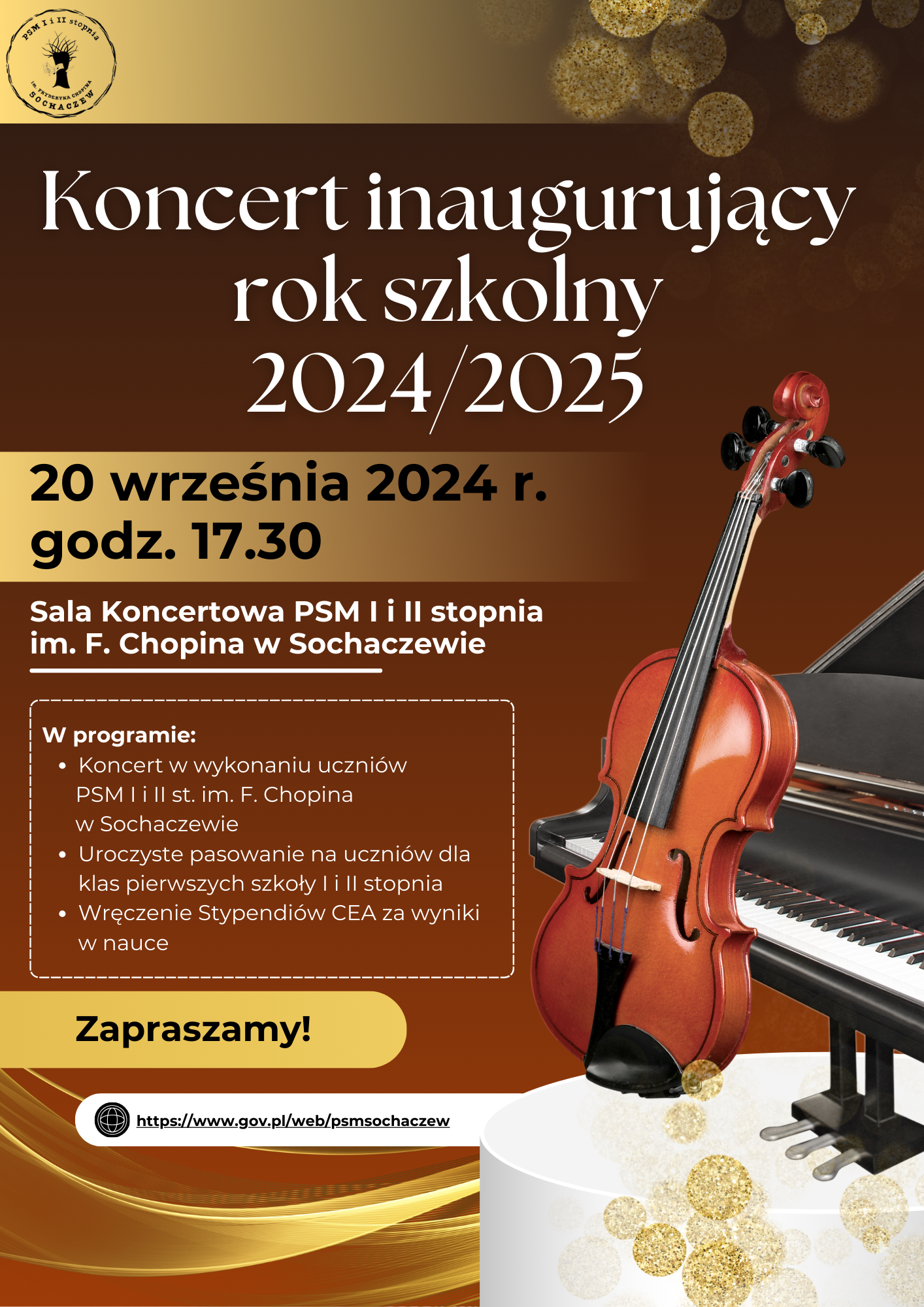 Zapraszamy na Koncert, którym rozpoczniemy nowy rok artystyczny 2024/2025 w Państwowej Szkole Muzycznej I i II stopnia im. F. Chopina w Sochaczewie. Koncert rozpocznie się o godz. 17.30 w Sali Koncertowej naszej szkoły.